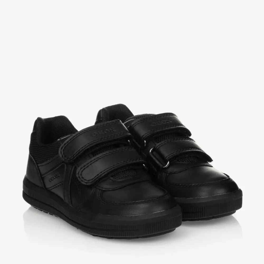 Boys black leather trainers by Geox, with velcro fastening straps. Ideal shoes for school, they are they are breathable, antibacterial and shock absorbing, and are designed with durable heel and toe protection. They have a non-slip, non-marking rubber sole.