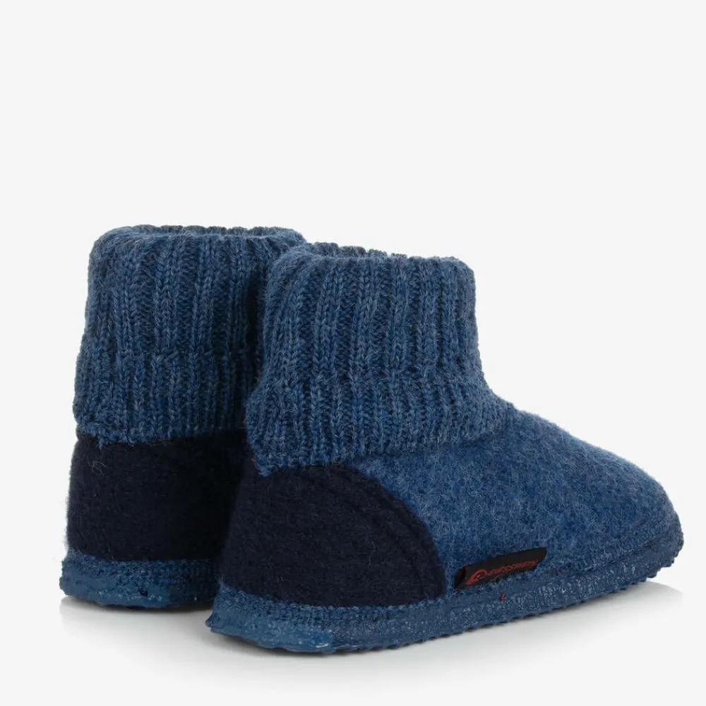 Blue felted slippers for boys and girls by Austrian brand Giesswein, inspired by the adult collection. Made from pure virgin wool, these comfortable thermo-regulating boot-style slippers have cosy knitted cuffs, navy blue panels on the back of the heel, and branded tabs on one side. The non-slip rubber soles are ultra-lightweight and flexible.