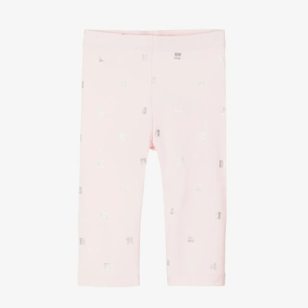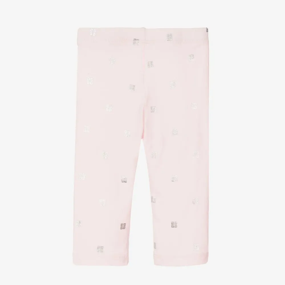 Pale pink leggings for little girls by luxury French brand Givenchy, made in soft and stretchy cotton jersey. Easy wearing, they are patterned with shiny silver iconic 4G logos and have a comfortable elasticated waistband.