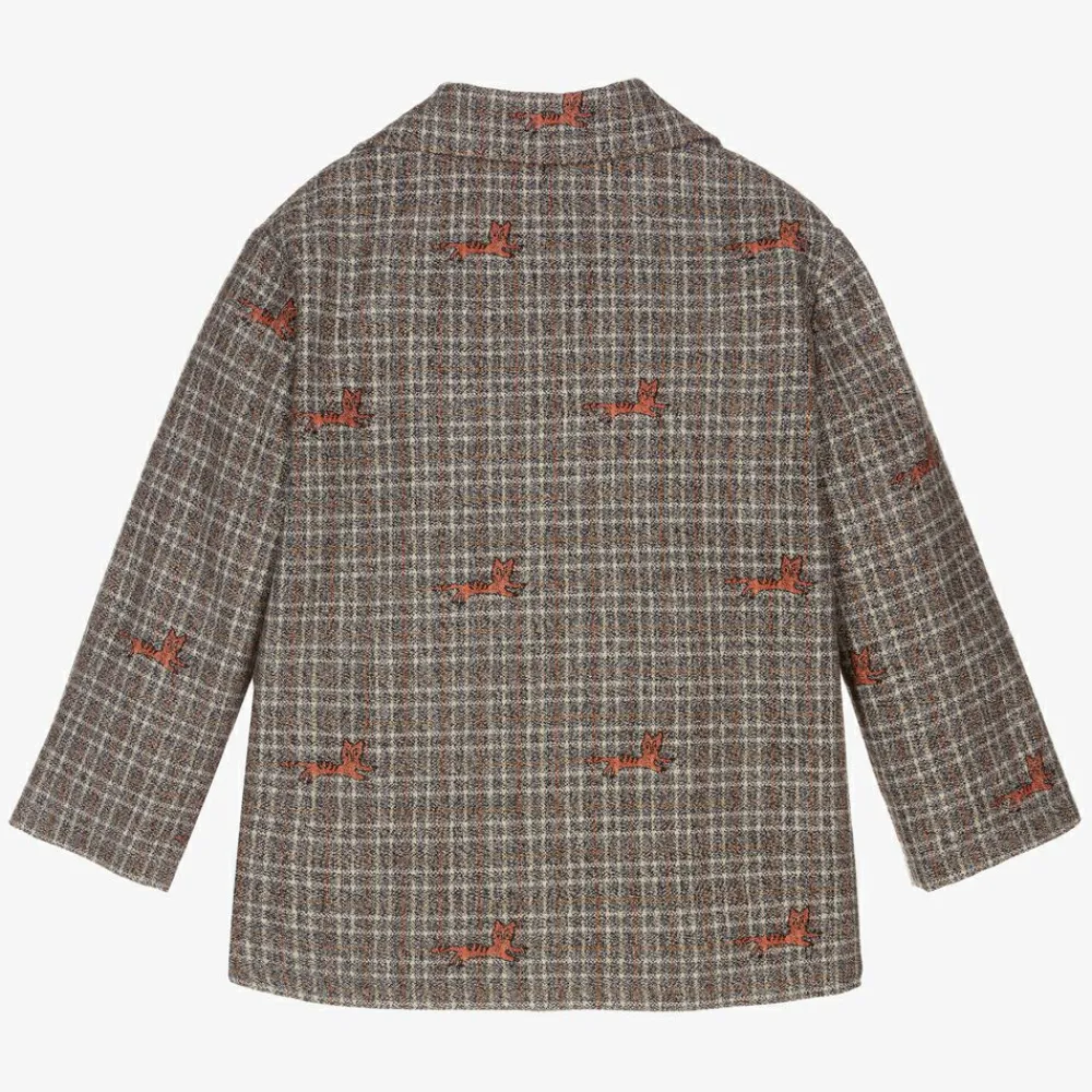 Little boys grey and orange check jacket by luxury brand Gucci, made in a lightweight wool blend. It has an adorable cat motif inspired by the House's menagerie, and the colour is reflected in the silky soft cupro lining. The jacket has popper fastenings, and patch pockets on the chest.