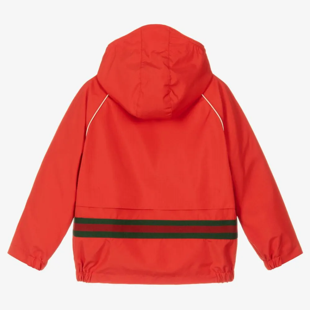 A stylish red windbreaker jacket for boys from Italian luxury designer Gucci, expertly crafted in cross-hatch ripstop for a lightweight feel. Synonymous with the brand, this hooded layer has a recognisable Interlocking G logo patch sewn on the chest and signature Web taping on the back in red and green. The contrast ivory piping on the raglan sleeves and the soft mesh lining add sporty elements to this practical design. Other functional details include a full zip front, slanted front pockets and elasticated trims on the cuffs and hem.