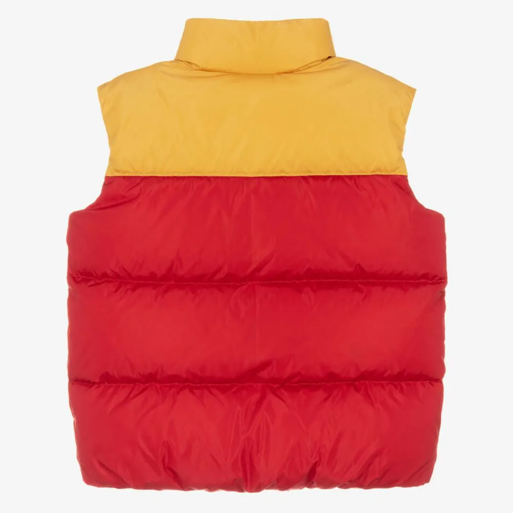 In red and mustard yellow, this colourblock puffer gilet for little boys is by luxury Italian brand Gucci. It has an Interlocking G logo patch on the front, with the signature green and red Web trim applied to the chest for an unmistakable designer look. A combination of practicality and style, this sleeveless layering option is silky smooth and padded in soft down for superior comfort and warmth. It has an elasticated hemline, useful front pockets, and a comfortable jersey lining.