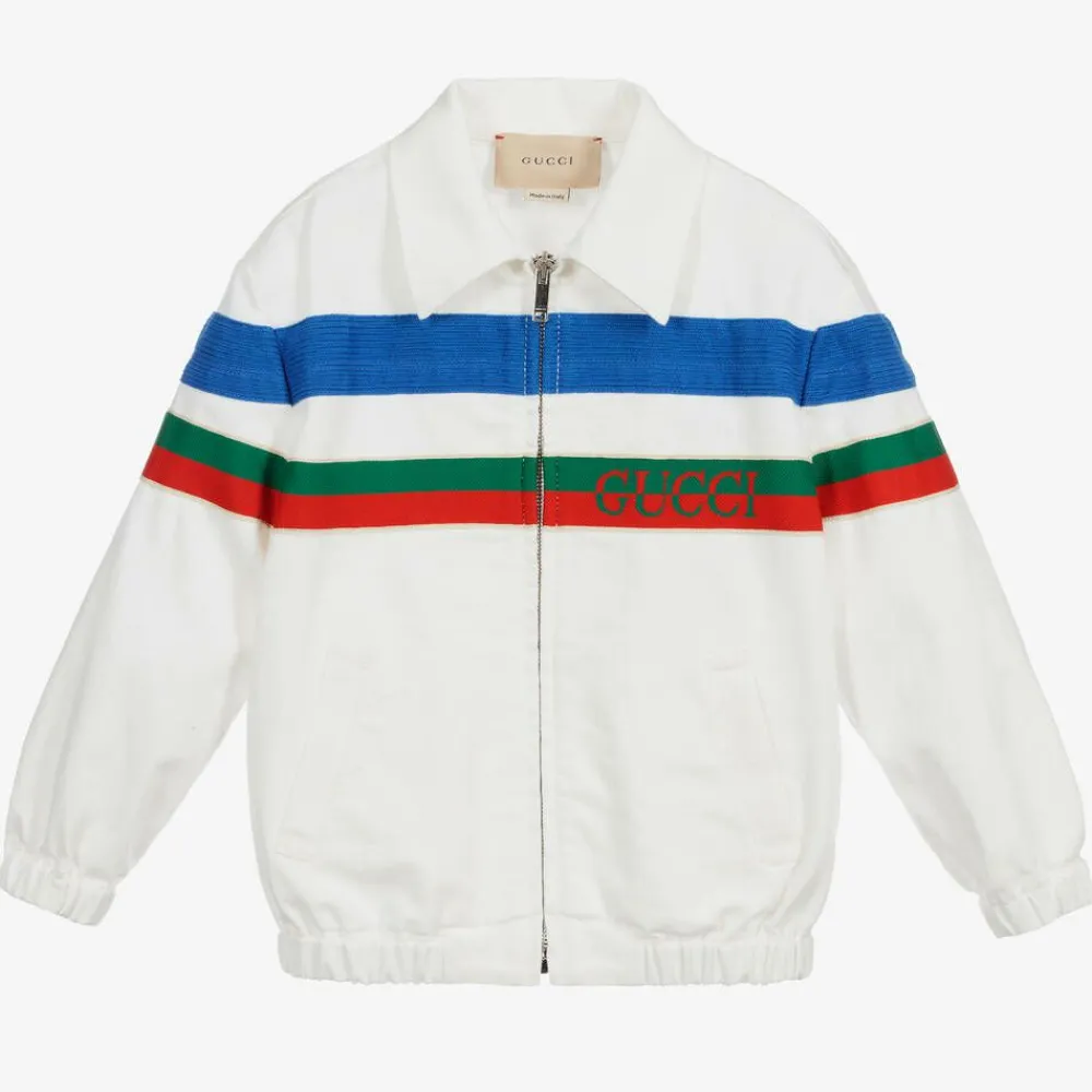A stylish, off-white cotton twill jacket for boys from luxury brand, Gucci, inspired by the adult collection. This zip-up jacket has a green and red, Web striped logo jacquard trim, reworked from the band of the vintage tracksuit. The cuffs and hem are gently elasticated and there is blue taped trim on the top.