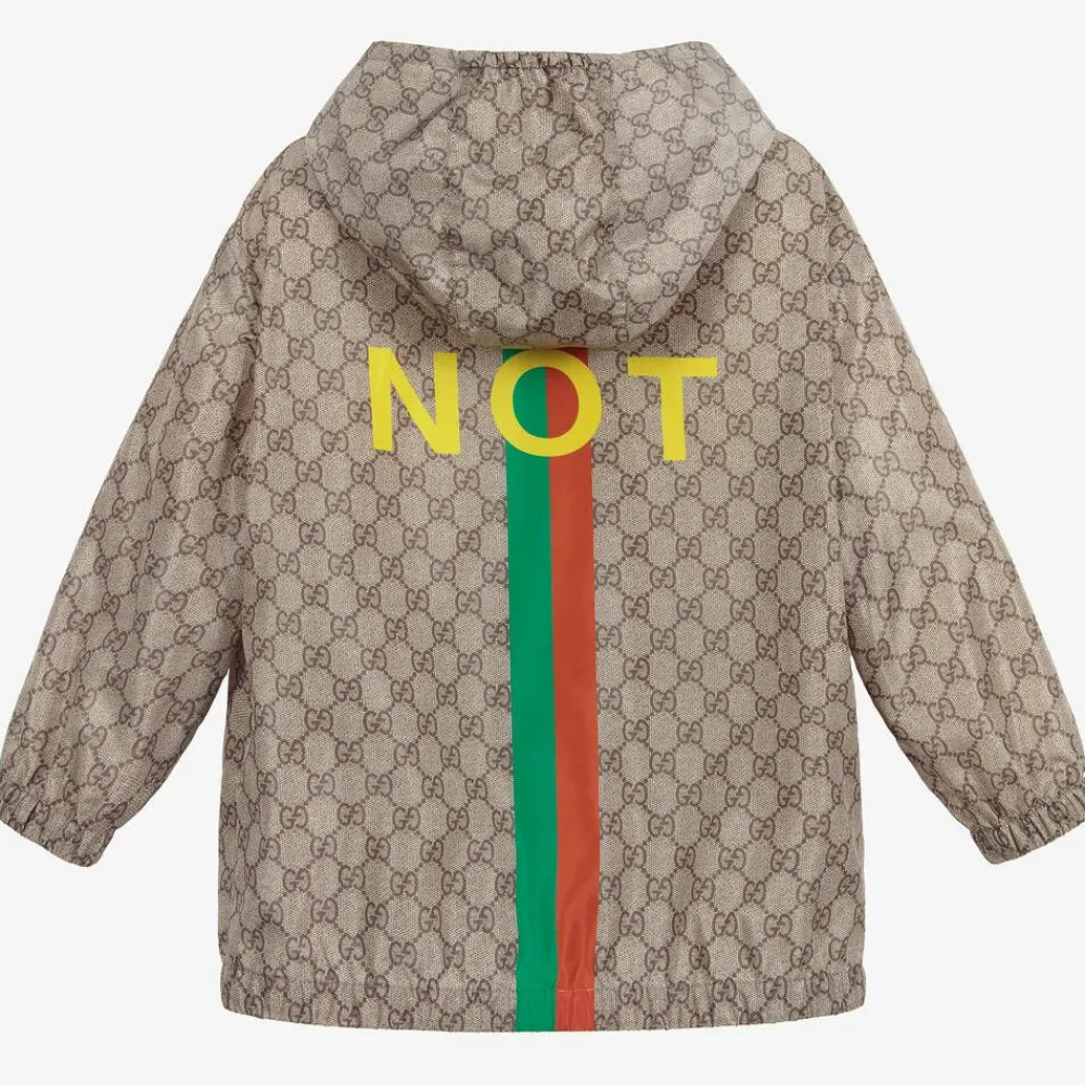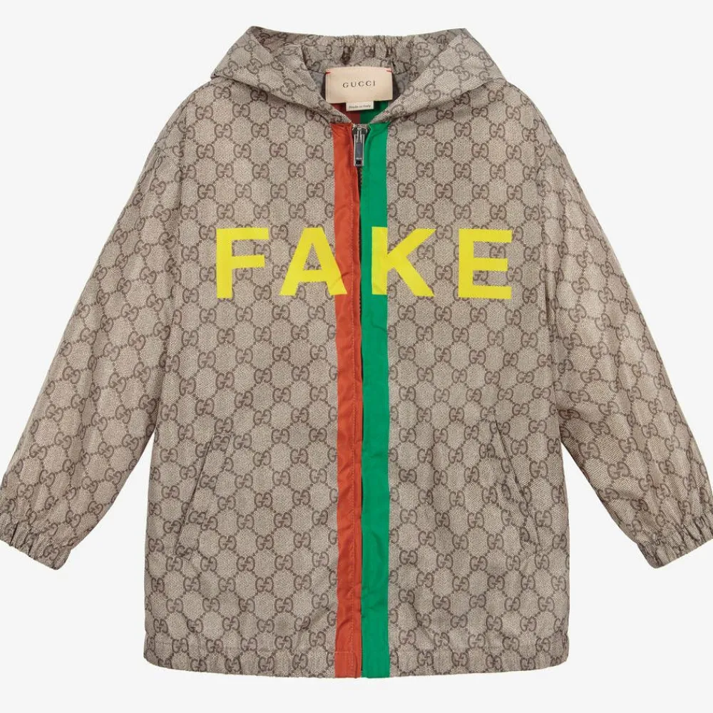 Beige Mini-me zip-up windbreaker jacket for boys and girls by Italian luxury brand Gucci, in the GG monogram print. It has an oversized fit, with the slogan 'FAKE/NOT' printed in yellow, along with the iconic red and green Web stripes. There are pockets on the front and a fixed hood.