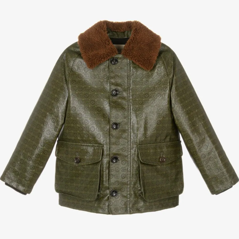 A dark green jacket for boys and girls from Gucci, crafted in a cotton mix. The brown fluffy shearling collar and smooth coated fabric provide interesting uses of texture on this luxurious jacket. In the label's signature boxy silhouette, this classic-meets-modern piece is enhanced by Double G Geometric branding and logo buttons on the front and patch pockets. It is lined with gentle-on-the-skin cotton and the ribbed cuffs are knitted in cosy wool. Logo engraving on the front zip adds that extra designer detail.