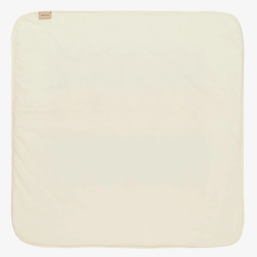 Distinctive Gucci style for baby boys and girls, this ivory padded blanket has a bold blue, yellow and orange Web design on the front, featuring the Interlocking G logo print. Made in beautifully soft and comfortable cotton jersey, it has a luxurious wool blend padding for added warmth. It makes an ideal nursery accessory or a comfortable surface for baby to lie on.