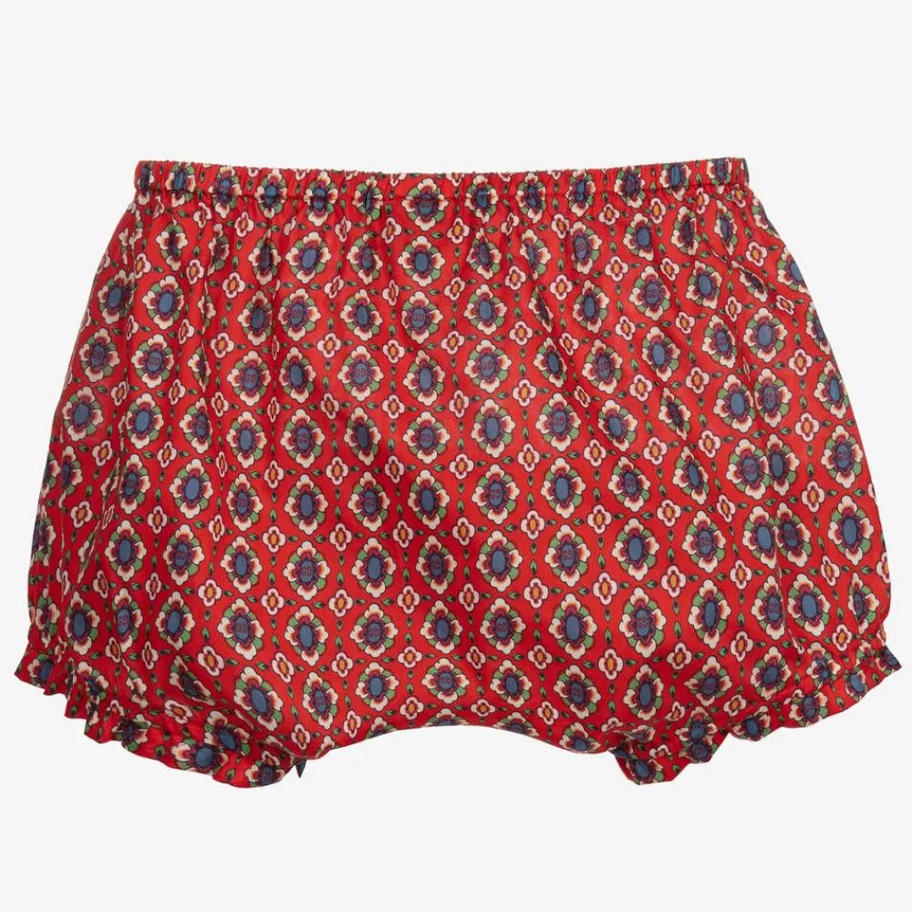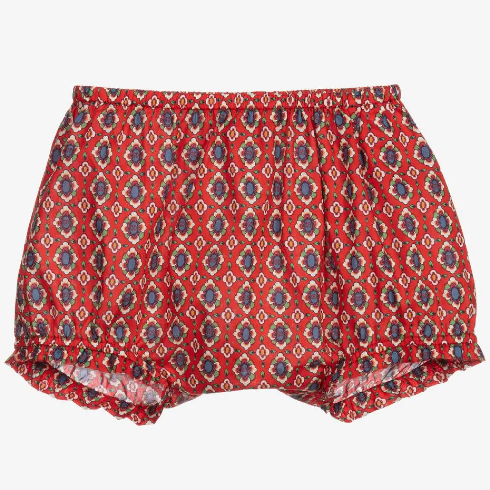 Red bloomer shorts for little girls by luxury Italian brand Gucci, made in soft, lightweight cotton. They have a colourful floral and GG logo pattern, with a softly elasticated waistband and leg openings.