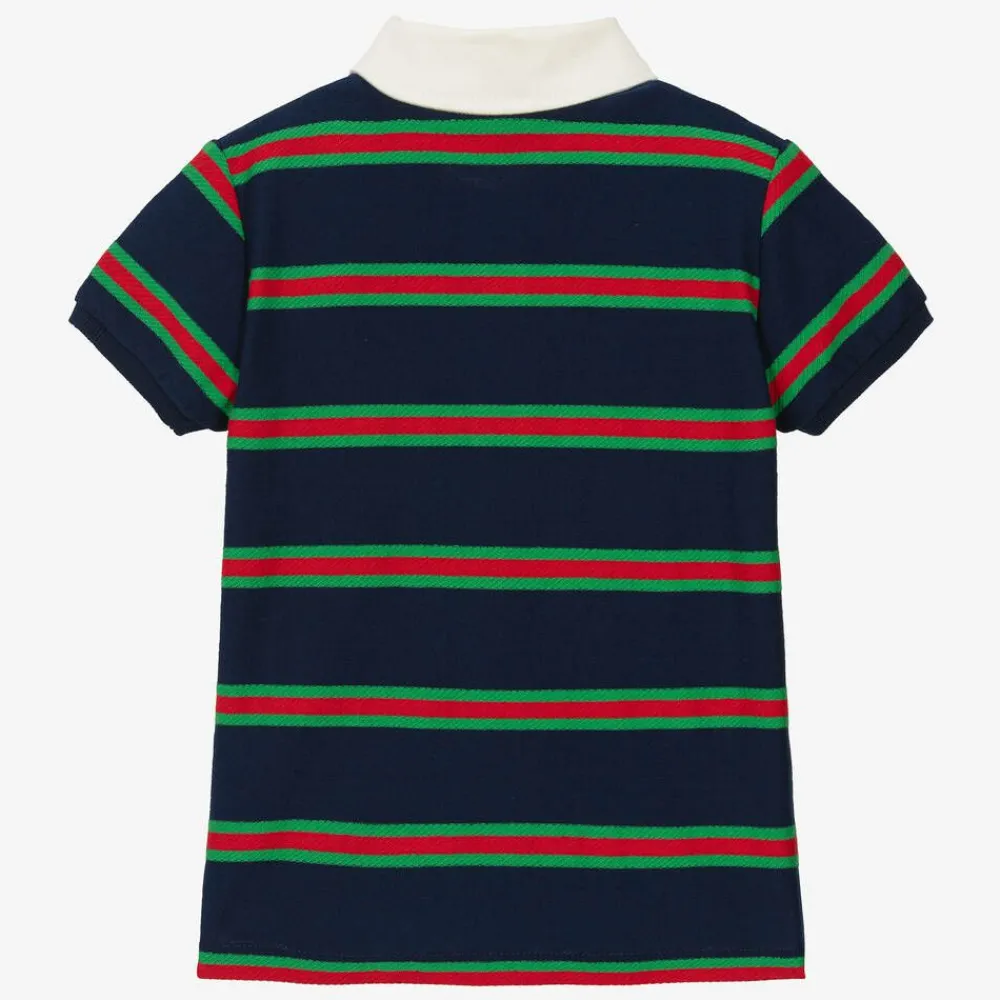 A navy blue polo shirt for little boys by luxury Italian brand Gucci, made from soft cotton jersey. With a structured white twill collar, this casual piece is defined with the House's iconic Web stripes in red and green, along with distinctive Interlocking G logos embroidered on the chest. It has lightly ribbed trims, side vents on the hem, and pearlescent button fastenings on the front.