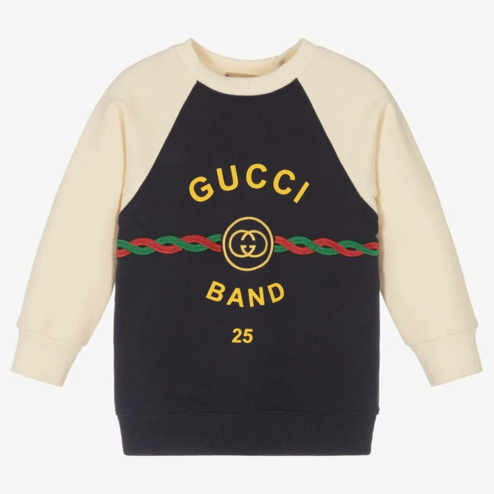 From luxury brand Gucci, a navy blue cotton sweatshirt for little boys. It is crafted in soft, medium-weight jersey with ivory raglan sleeves and softly ribbed trims. This casual design is enhanced by the Italian label's yellow logo print, with 'Band' lettering, an embroidered Interlocking G motif, and torchon detail in the iconic red and green Web. It fastens easily on the back with concealed poppers.