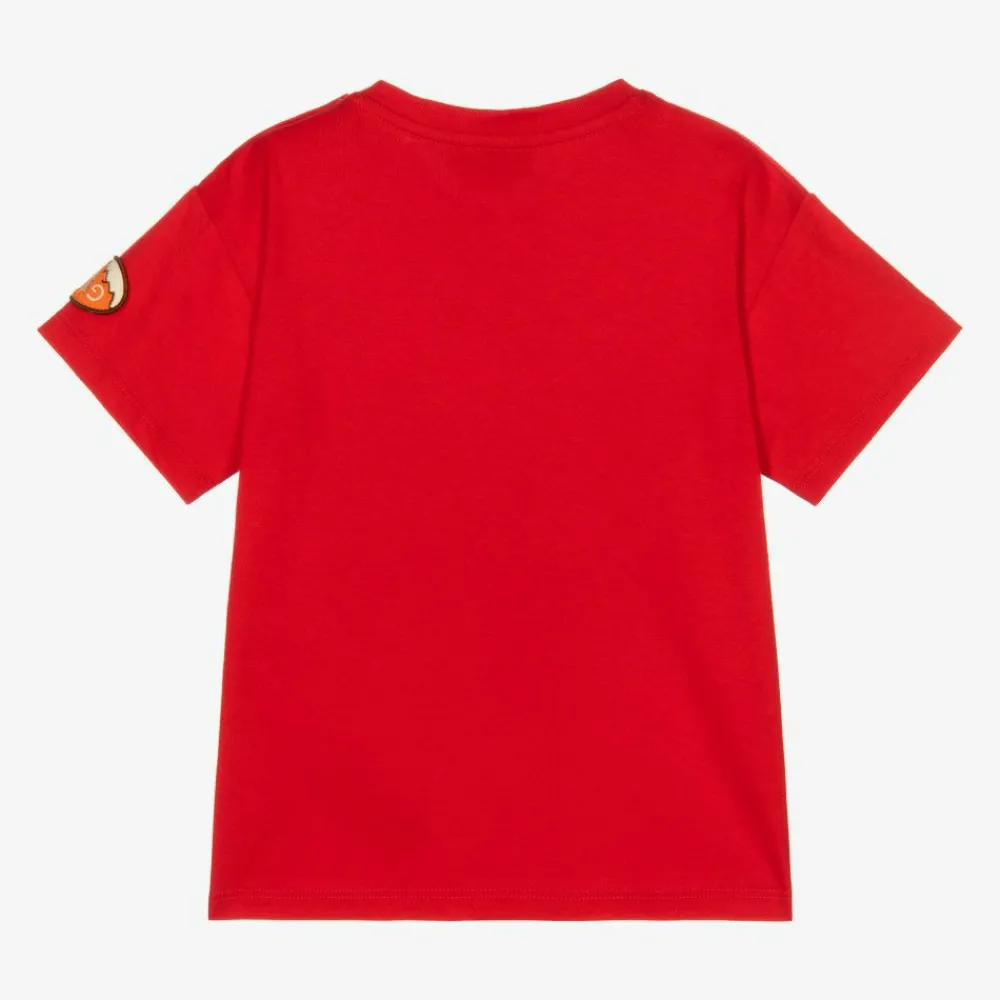 Red oversized T-shirt for younger boys and girls by luxury Italian brand Gucci, made in soft cotton jersey. It has a beige flocked print on the front with the phrase 'Guccy ciel de nuit mon petit chou' and a teddy bear. The phrase references a nickname for the house, the night sky and a term of endearment. It has a logo patch on one sleeve and fastens with poppers on one shoulder.