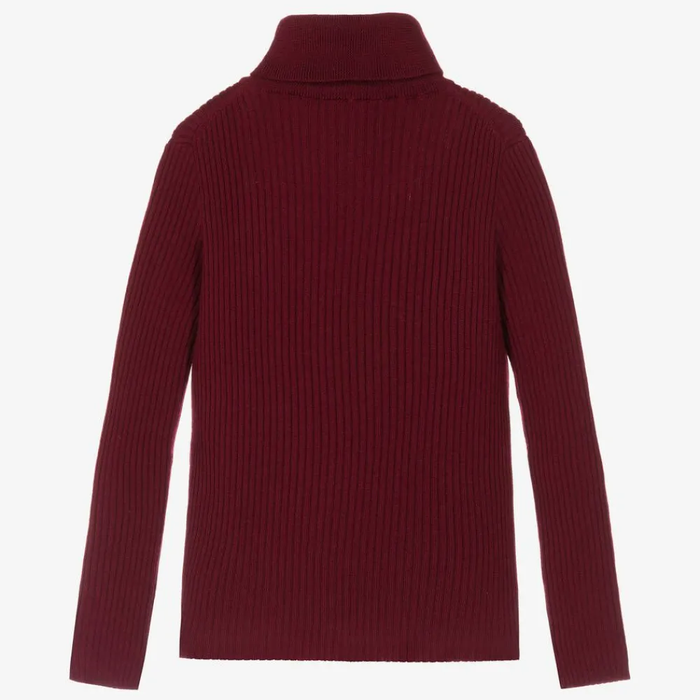 Gorgeous burgundy red wool roll neck sweater for boys and girls by luxury Italian brand Gucci, featuring the iconic Interlocking G logo embroidered on the chest. Made from a luxuriously soft and stretchy ribbed knit, and with a close-fitting silhouette, this top is cosy, comfortable, and effortlessly stylish.