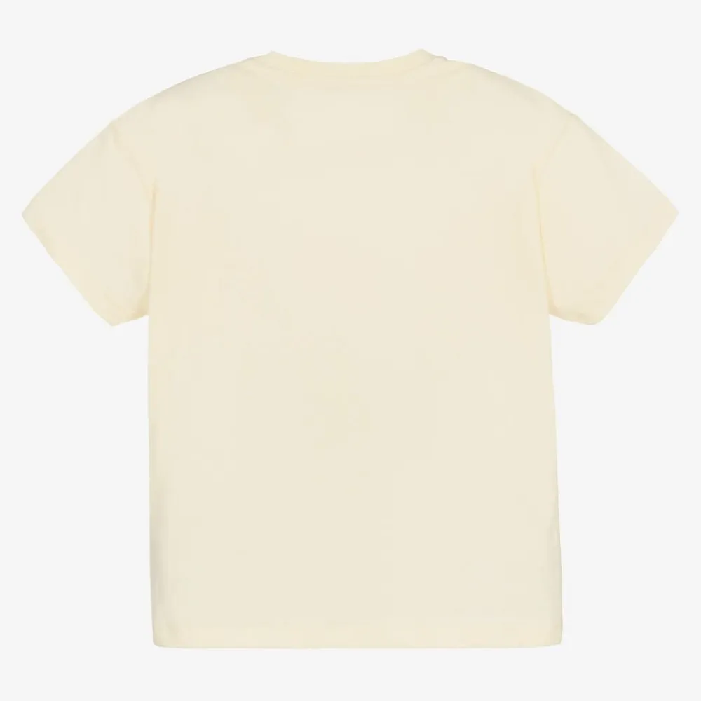 Ivory T-shirt for little boys and girls by renowned luxury brand Gucci, made from soft cotton jersey. The fun cartoon print on the front features the beloved characters of The Jetson family, alongside a multicoloured Gucci logo print. It has a lightly ribbed crew neck and popper fastenings on one shoulder to help with dressing.