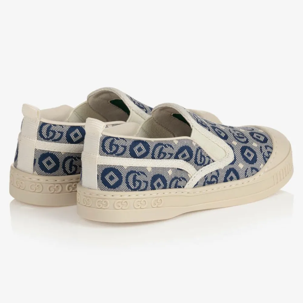 Blue Tennis 1977 trainers for boys and girls from luxury Italian brand Gucci, in a comfortable slip-on style. They are a woven in a cotton blend with a blue and ivory Double G geometric pattern and have elasticated inserts for easy slip-on. The flexible ivory sole has embossed logos around the heel and underneath for the ultimate designer finish.