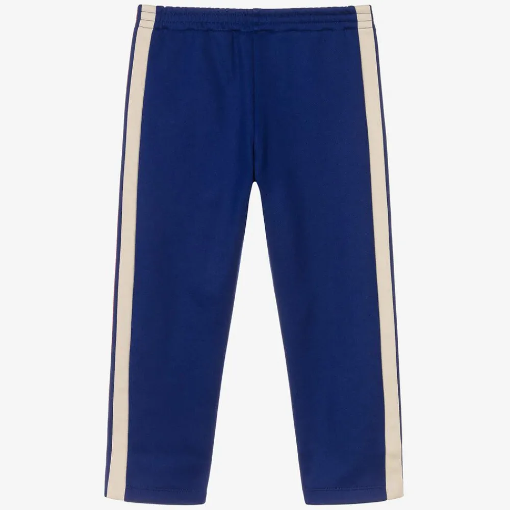 Royal blue joggers for boys by luxury Italian designer Gucci, made from silky cotton blend jersey. They have an elasticated waist for a comfortable fit, the ivory and red stripes on each leg make a statement and there is an appliqué logo on one leg.