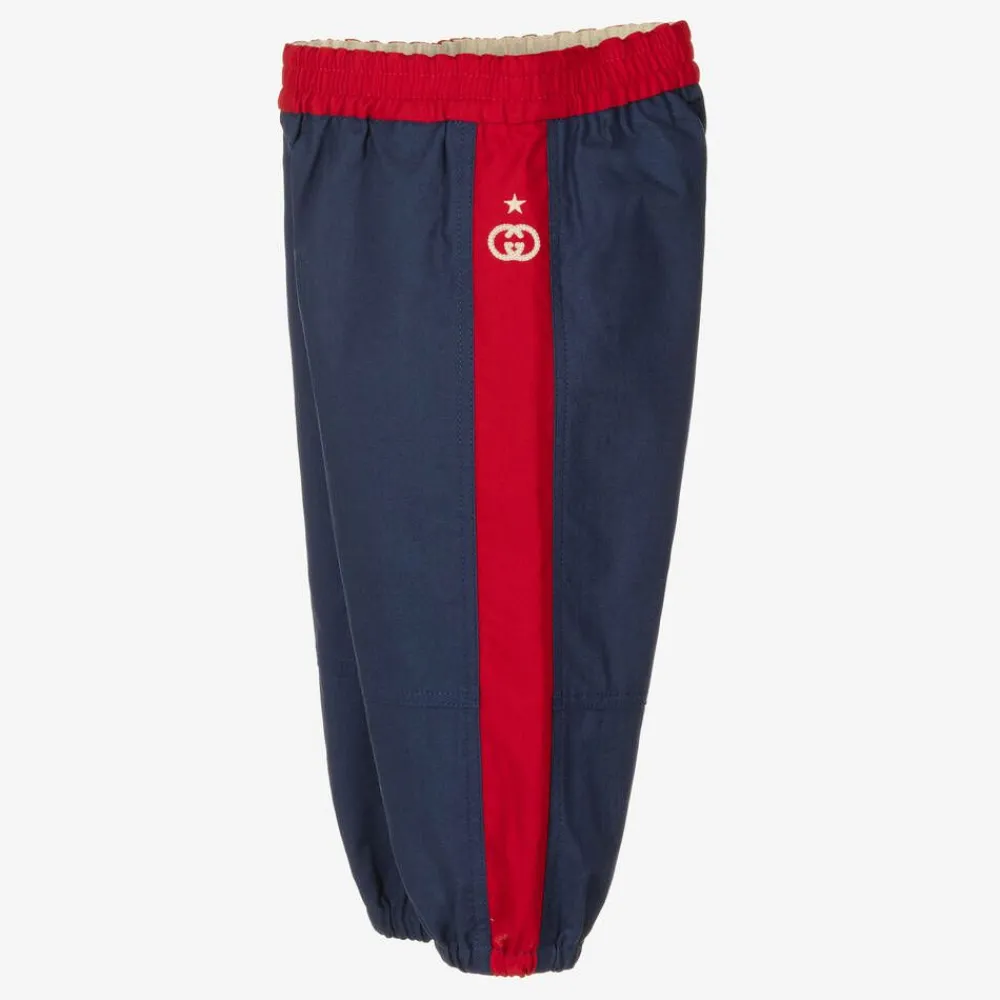 In the designer's updated Sylvie web colours, these sporty blue and red joggers for little boys are from Italian label, Gucci. Woven in soft cotton, they are finished with a thoughtful, ivory Interlocking G star logo embroidery on one side. Paying homage to the brand's bold styling, they have a cool colourblock effect. Finished with comfortable, elasticated trims, your little one will be cool and casual in these luxury joggers.