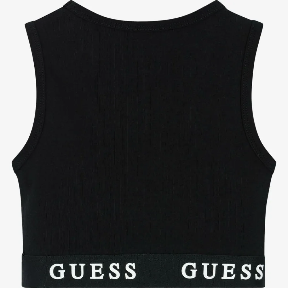 Black cotton-blend cropped top for girls by Guess, ideal for sports and exercise. It has a black tape trim, decorated with white rubber logo prints for a distinctive designer look. This item contains recycled materials for a positive eco impact.