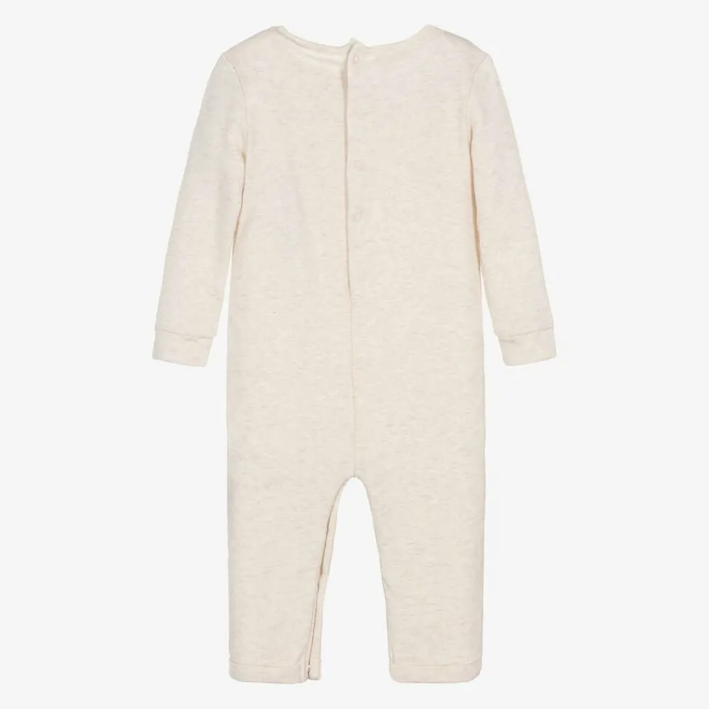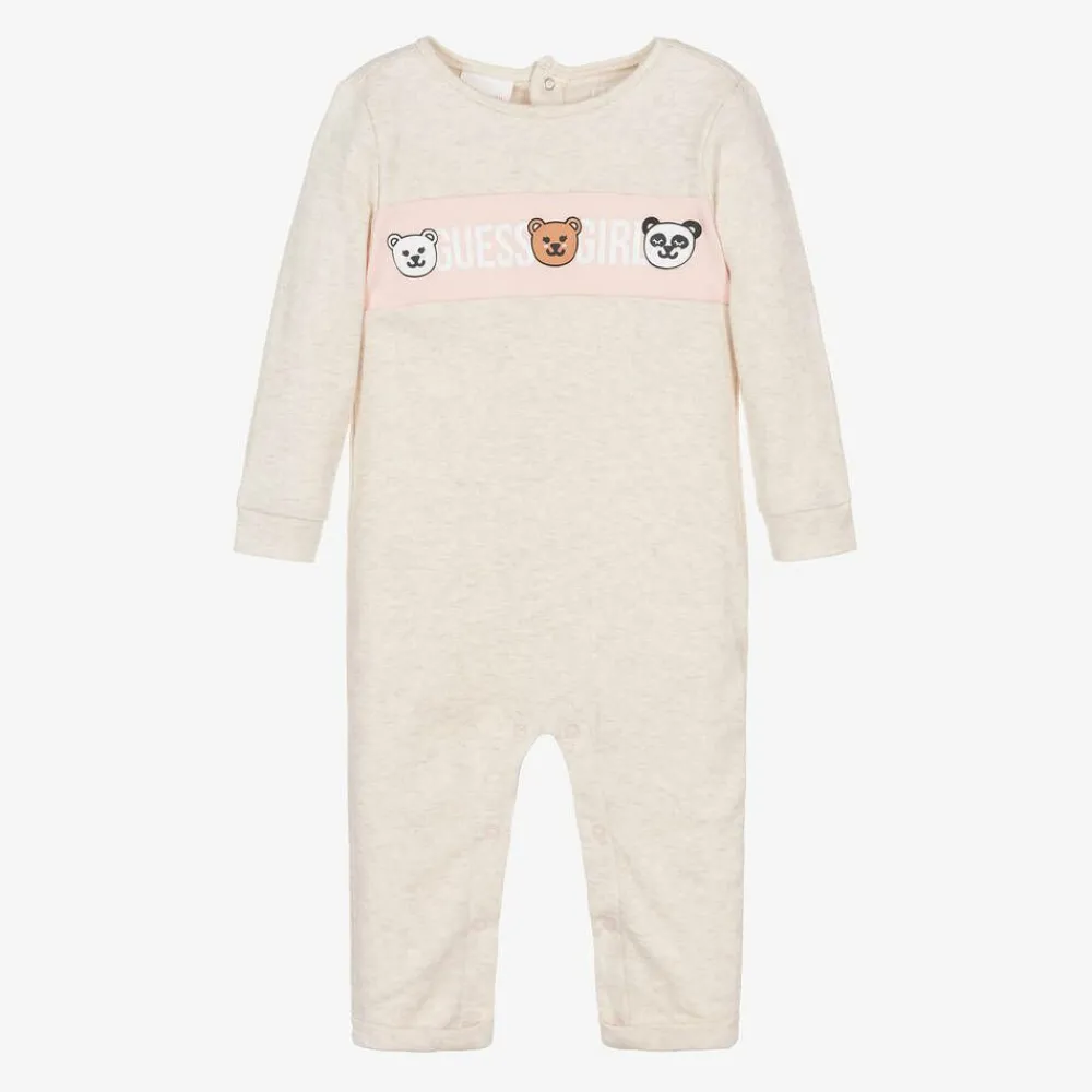 Beige marl romper for baby girls by Guess, made in soft cotton jersey. Comfortable against delicate skin, it has a pink band across the chest with cute panda and bear motifs and a glittery white logo. There are cute turn-ups on the legs and popper fastenings on the back and between the legs for easy dressing and changes. This product contains organic cotton fibres.