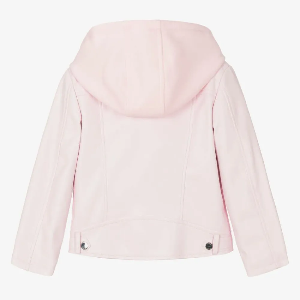 A pink faux leather jacket for girls by Guess, with side pockets and a silky lining. A double-layered look, this cool biker jacket has a removable, zip-on hood panel made in soft jersey. The jacket has edgy silver-hued hardware, a heart-shaped logo charm on the hem, and branded faux poppers on the lapels. Both the jacket and hood panel fasten easily with front zips.