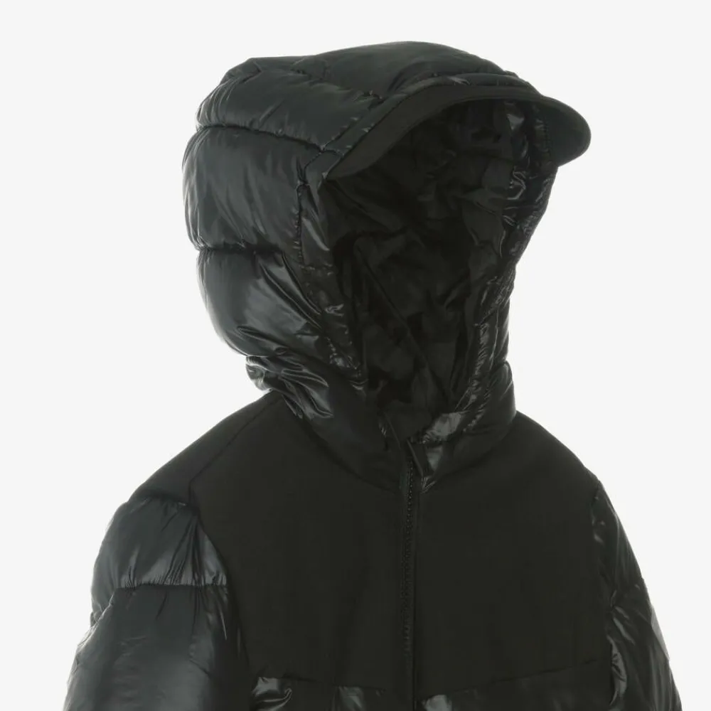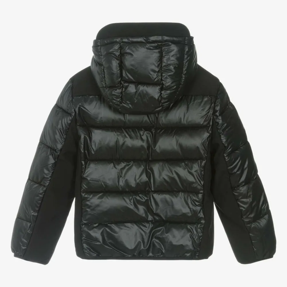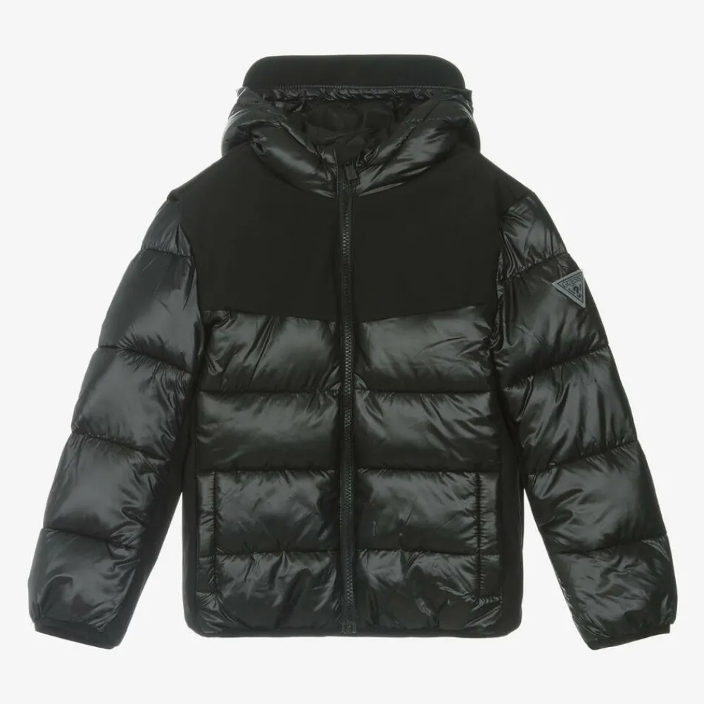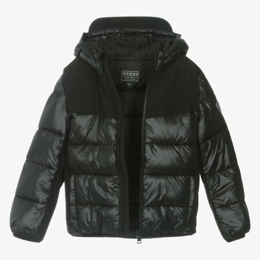 From Guess for Junior boys, a black puffer jacket padded for added warmth. This comfortable hooded jacket, is made from smooth silky material with matte panels for a subtle contrast and finished with a rubberised Triangle logo.