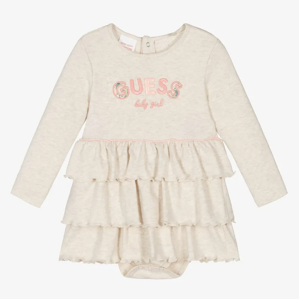 Cute beige marl dress for baby girls by Guess, made in soft cotton jersey. It has long sleeves, with pretty ruffles and pink trim on the skirt. Adding designer appeal, there is a pink embroidered logo on the front with floral trims and sparkles. There are popper fastenings on the back and between the legs on the useful attached knickers. This product contains organic cotton fibres.