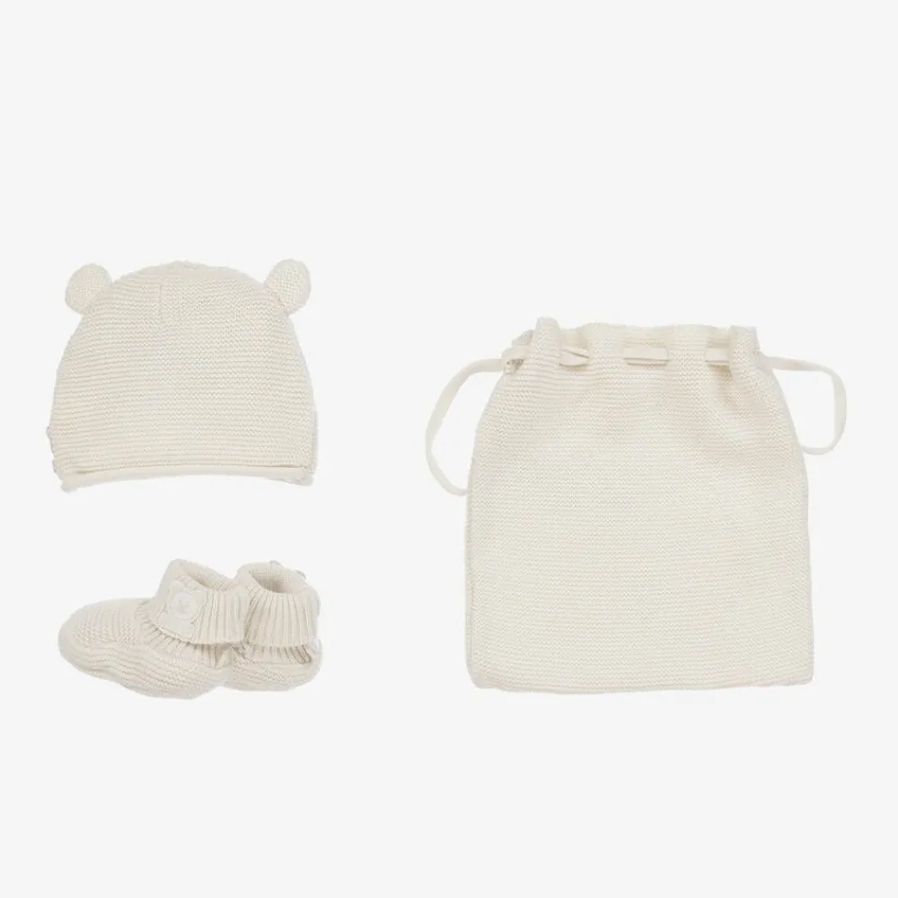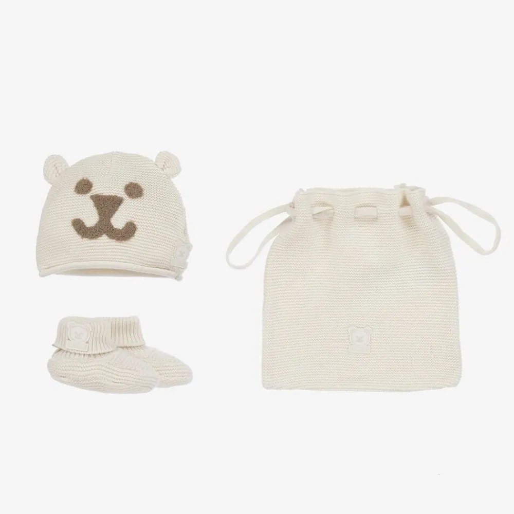A sweet ivory hat and booties set for baby boys and girls by Guess, knitted in soft cotton. Lovely as a gift idea, the set comes with a knitted drawstring bag. The hat is embroidered with beige teddy bear features on the front, with faux leather teddy appliqués on all pieces. This item contains organic cotton fibre.