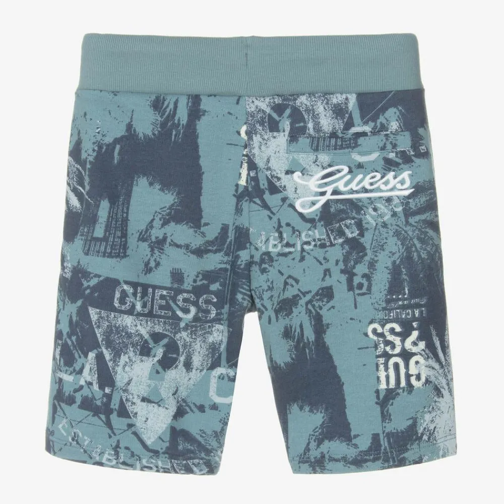 Soft, comfortable cotton shorts for junior boys by Guess, patterned with palm trees in shades of blue. For instant brand identity, the print also incorporates white logos, as well as an embroidered logo on the back pocket. Bermuda length, they are made in comfortable sweatshirt jersey, with an elasticated, drawstring waist for an ideal fit.