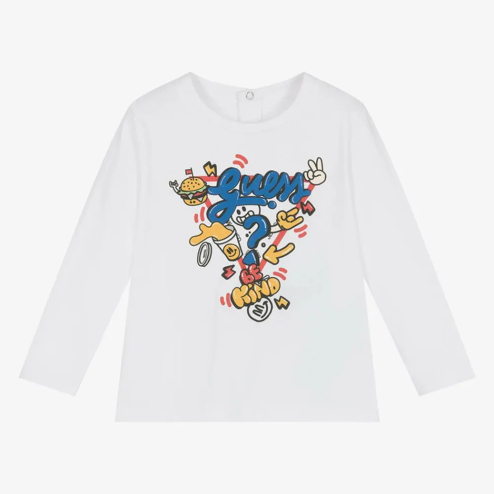 A white long-sleeved cotton top for baby boys by Guess. For a good vibe, the front has a colourful print of the iconic triangle logo in a fun cartoon-style graphic and 'be kind' slogan. The popper fastenings on the back allow easier dressing. This casual jersey top contains organic cotton fibre.