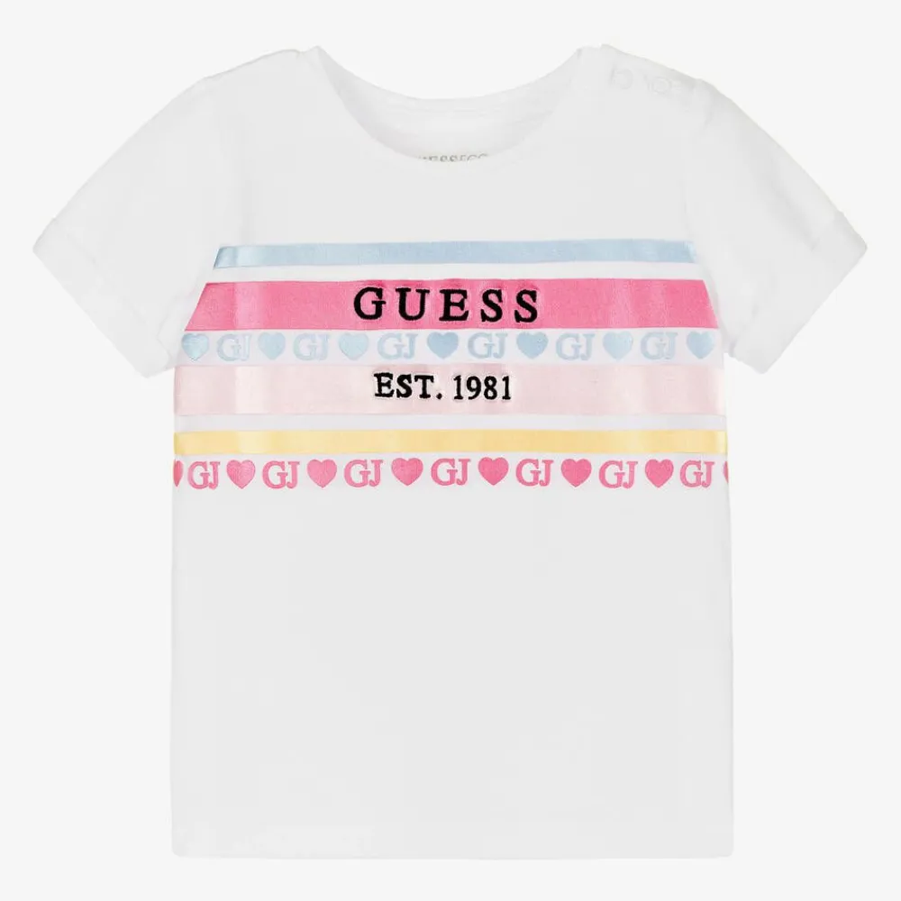 A white T-shirt for baby girls by Guess, made from soft cotton jersey. With pink, yellow and blue metallic stripes, it has printed hearts and embroidered branding on the front. Poppers fasten one shoulder for simple dressing. This garment contains organic cotton.