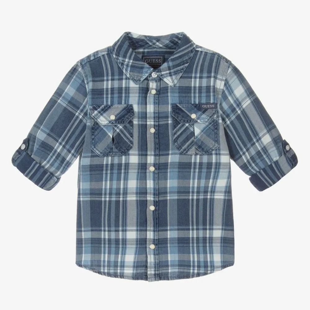 In shades of blue, a cool cotton shirt for younger boys by Guess, made in soft twill. This casual style has pearly popper fastenings on the front, chest pockets and cuffs, with a branded button fastening at the neck. There is a logo tab on the front for a subtle branded touch and the sleeves can be rolled up and secured with a button tab.