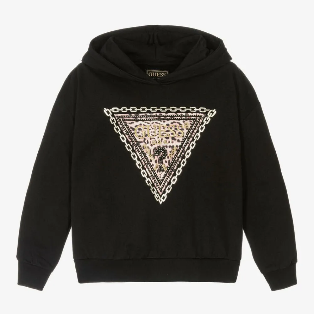 A casual, black hoodie for junior girls by Guess, made in mid-weight cotton jersey, with a soft, fleecy feel inside. The American brand's distinctive Triangle logo can be seen on the front, reimagined in a stylish animal print and detailed with sparkling diamantés and gold embroidery. This product contains organic cotton fibres.