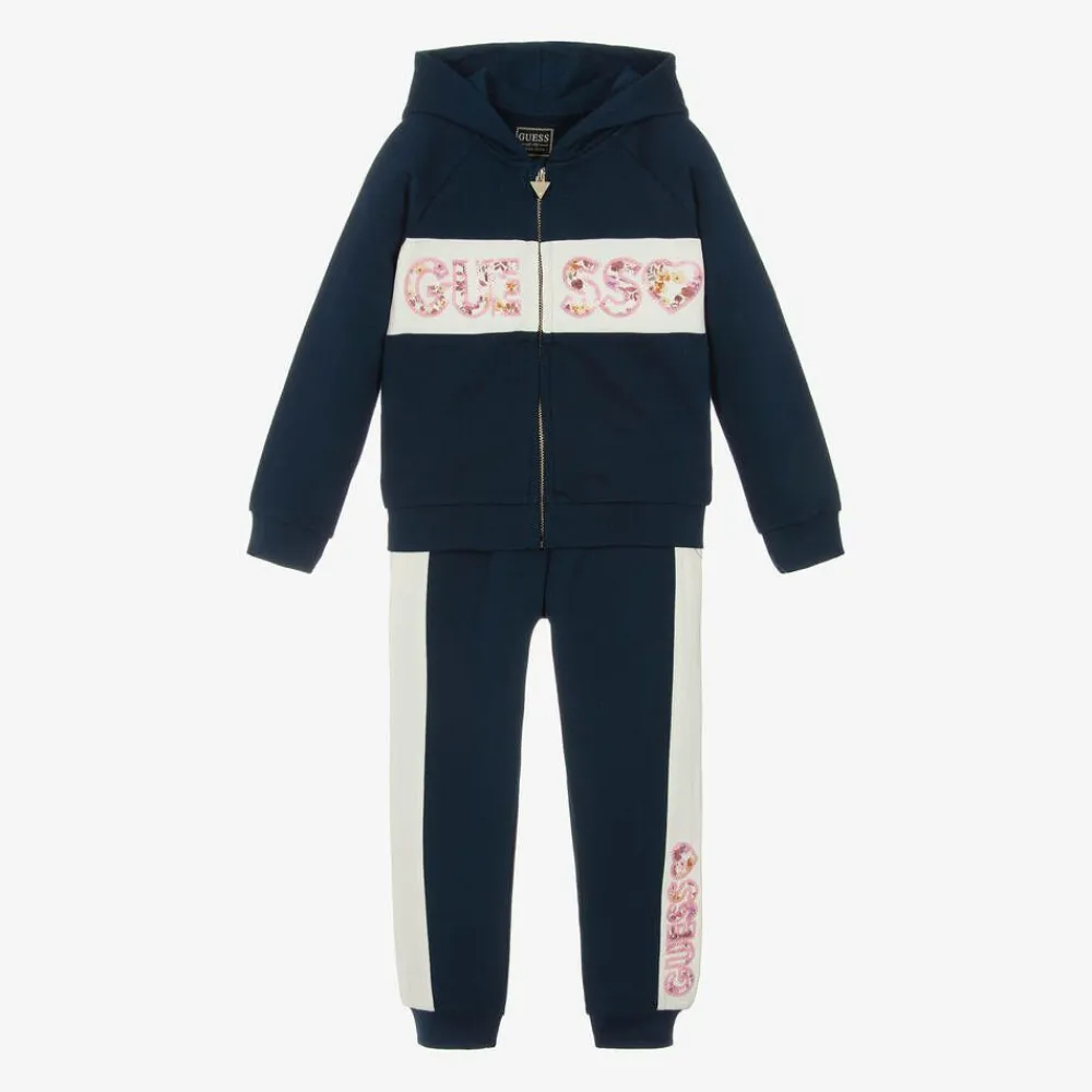 Navy blue tracksuit for younger girls by Guess, made in soft cotton jersey. Ideal for casual days, both pieces in the look are accented with sporty white stripes and pink sequin branding. The hoodie fastens with a zip on the front and the joggers have an elasticated waist for relaxed comfort.