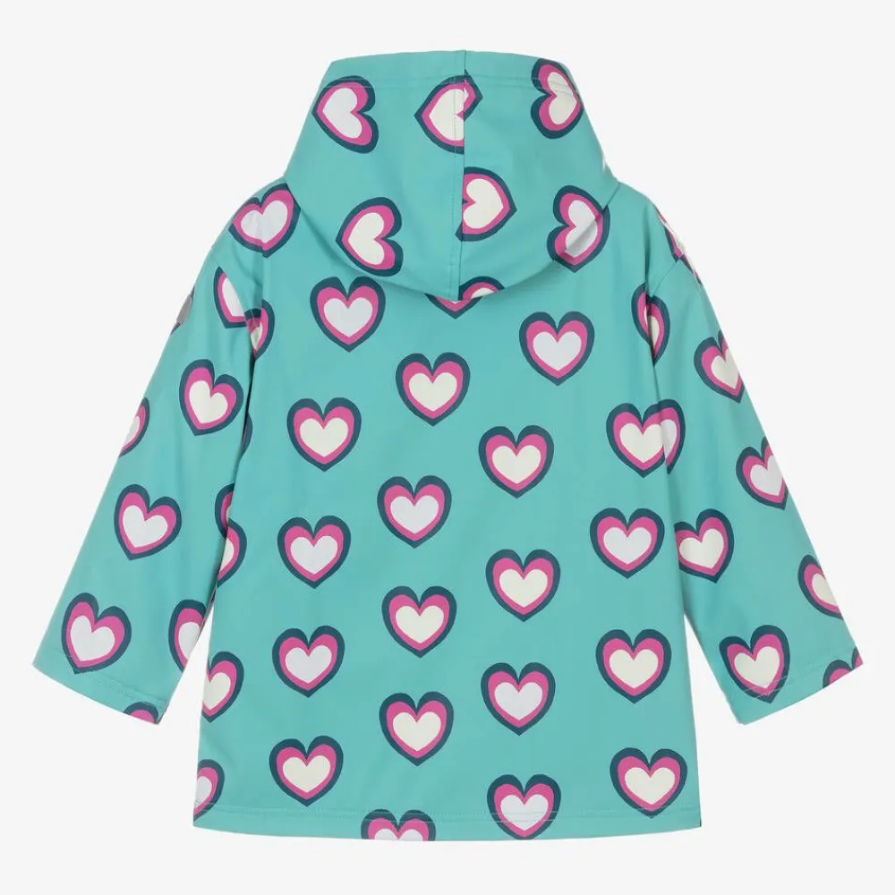 Turquoise blue zip-up raincoat for girls by Hatley, patterned with a pretty heart print that changes colour in the rain. It has a waterproof coating and is lined in soft towelling for gentle comfort. There are two frotn pockets and reflective logo badges on one sleeve and near the hem for improved visibility.