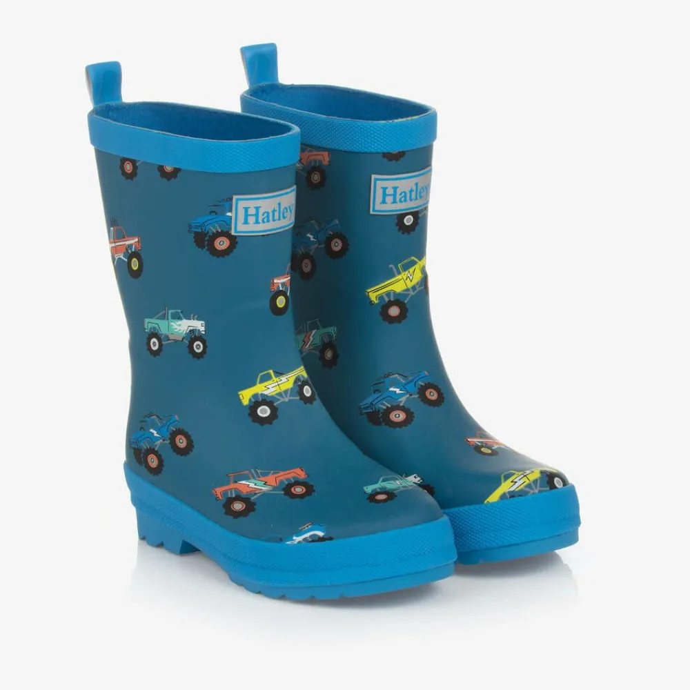 Teal blue matte-finish rain boots for boys by Hatley, with a monster truck pattern. Made from flexible rubber and lined in comfortable cotton, they have a light-reflective logo on the front and a cushioned, removable insole. The chunky rubber soles help improve grip when walking and splashing through puddles.
