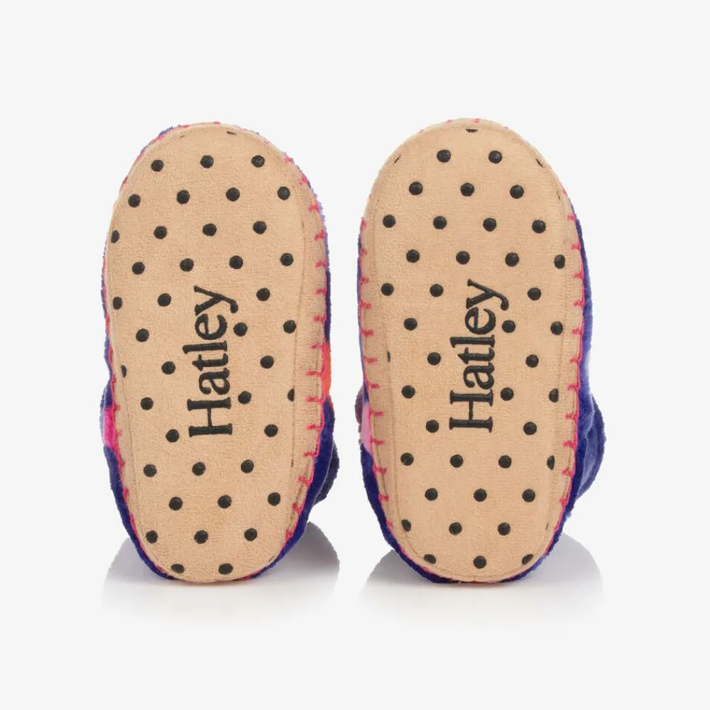 Super cosy, these purple slippers for girls by Hatley are made from soft plush with a fleecy lining. Easy to slip-on, this comfortable style has padded fabric outsoles with grips underfoot to prevent slipping. They have a colourful heart pattern for a fun finish.