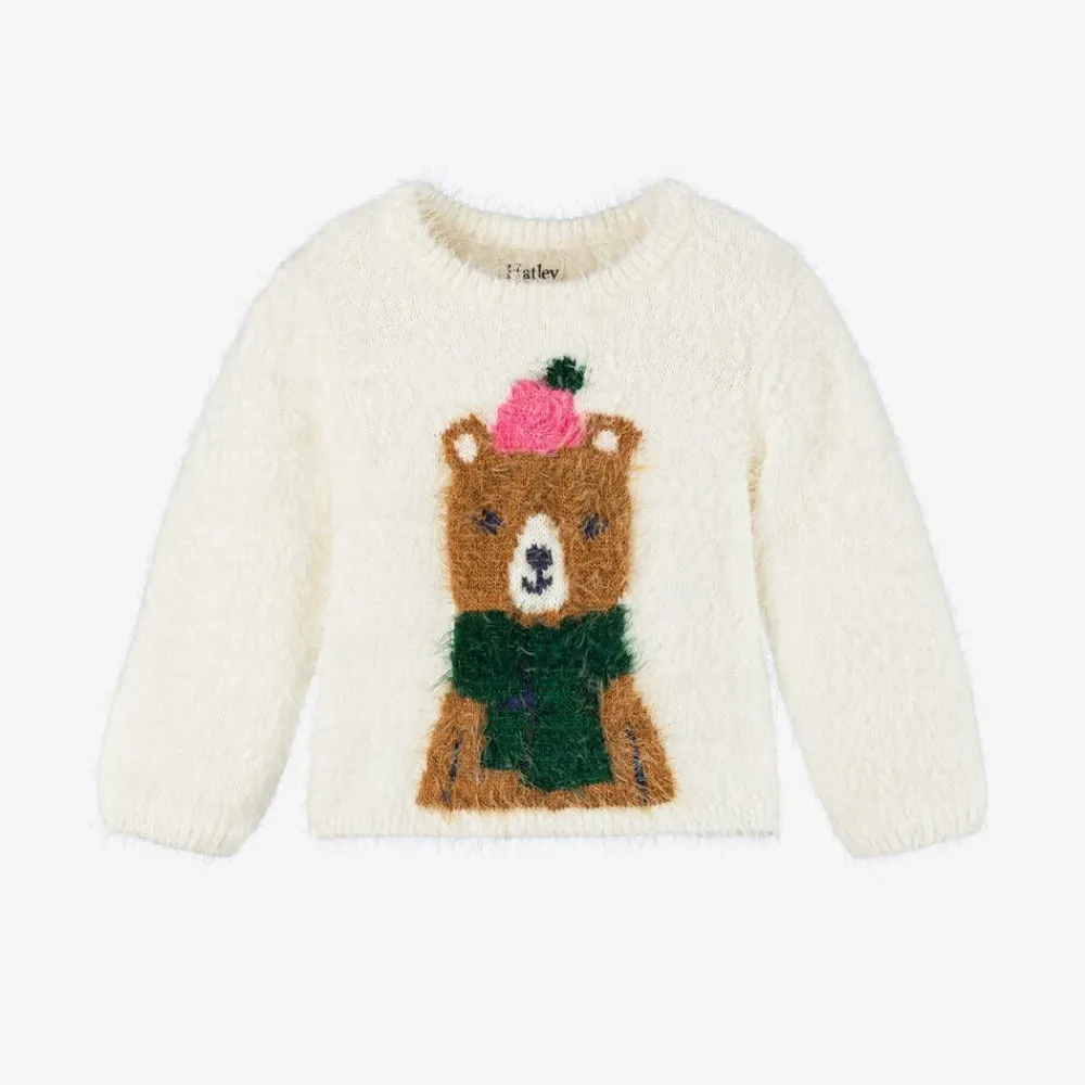 A beautifully soft and fluffy ivory sweater for little girls by Hatley. Cosy and comfortable, it has long sleeves and features an adorable bear motif on the front.