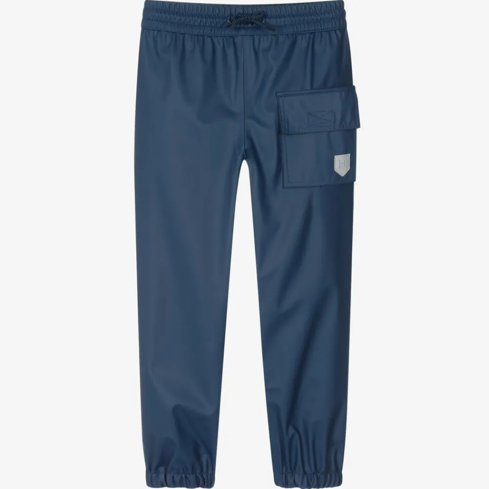 Navy blue waterproof 'Splash' trousers for boys and girls by Hatley. These practical trousers are great for active days in the rain and for keeping undergarments clean and dry. They have an elasticated waistband and ankles, with a functional drawstring on the waist. The cargo pocket secures with velcro and there are reflective logo badges on the back and front for safety.