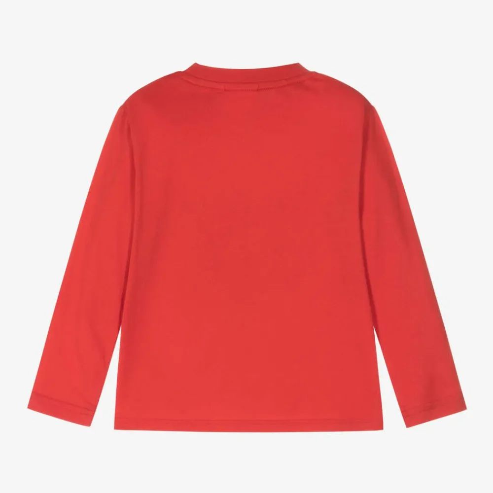 A red top for boys by HUGO, made in soft organic cotton jersey. This casual top is simply styled with a crew neck and long sleeves. The designer's name is displayed boldly on the front in black print for instant brand recognition.