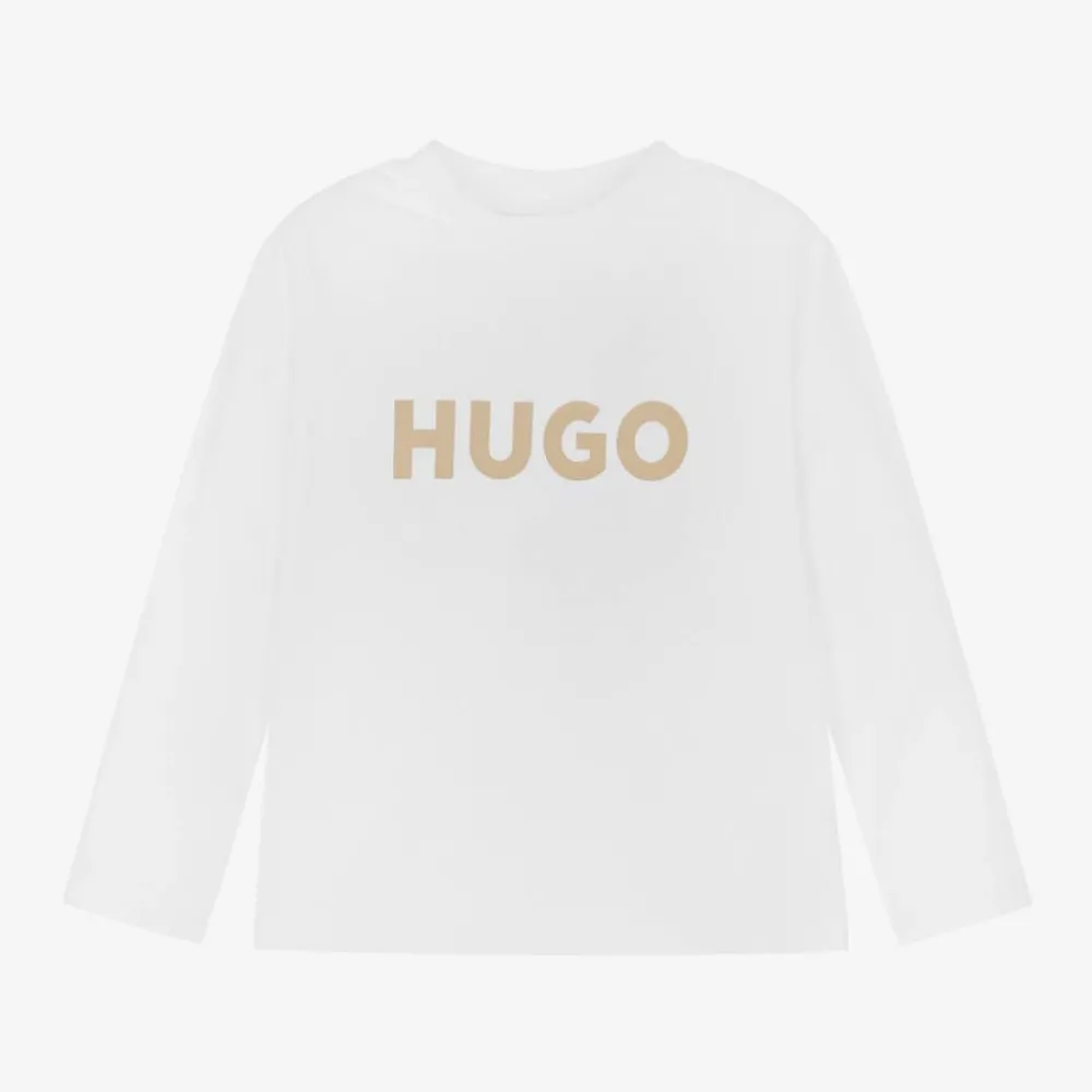 A white top for boys by HUGO, made in soft organic cotton jersey. This casual top is simply styled with a crew neck and long sleeves. The designer's name is displayed boldly on the front in beige print for instant brand recognition.