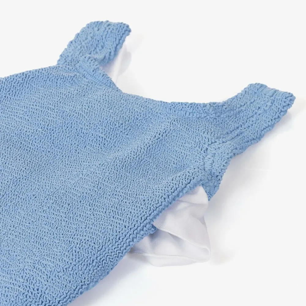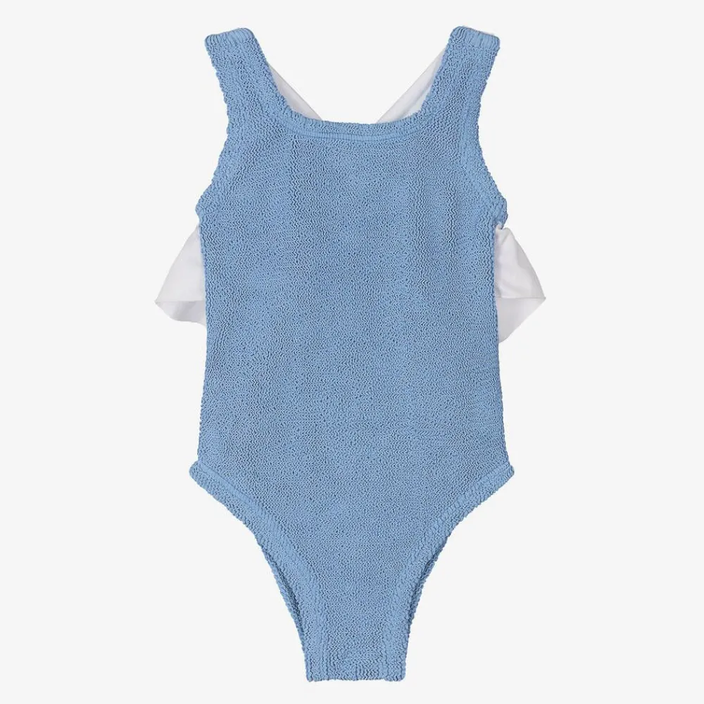 In a cornflower blue colourway, this stylish swimsuit for older girls is by the iconic swimwear brand Hunza G. Designed to grow with your child, this signature one-piece is made in the brand's bespoke super-stretchy Original Crinkle fabric. Lovely for resort wear, it has silky white cross-over shoulder straps, centred by a pretty bow, with a matching frill across the back.