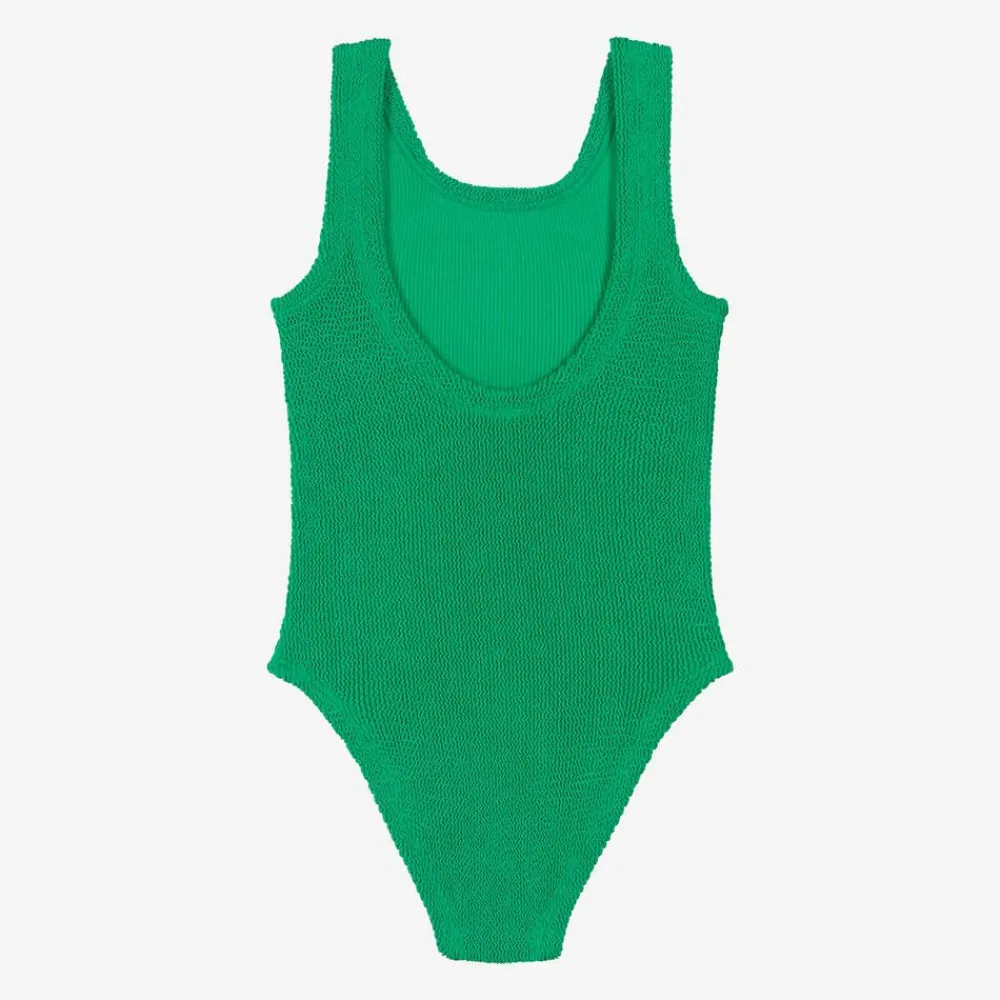 A classic emerald green swimsuit for older girls by Hunza G, made in the British brand's iconic Original Crinkle Fabric. This comfortable and timeless beachwear one-piece is styled with a scooped back. For lasting wear, the material offers effortless stretch, allowing the swimsuit to grow with your child.