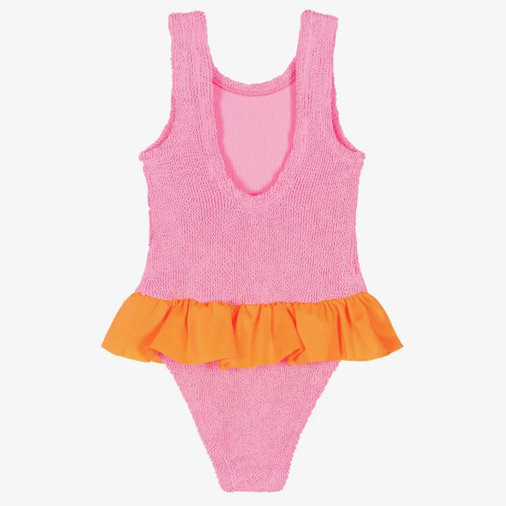 A scooped-back swimsuit for girls from luxury brand Hunza G, in bright pink with a neon orange frill. This stylish swimsuit offers lasting comfort thanks to its Original Crinkle fabric, a super-stretchy material signature to Hunza G.