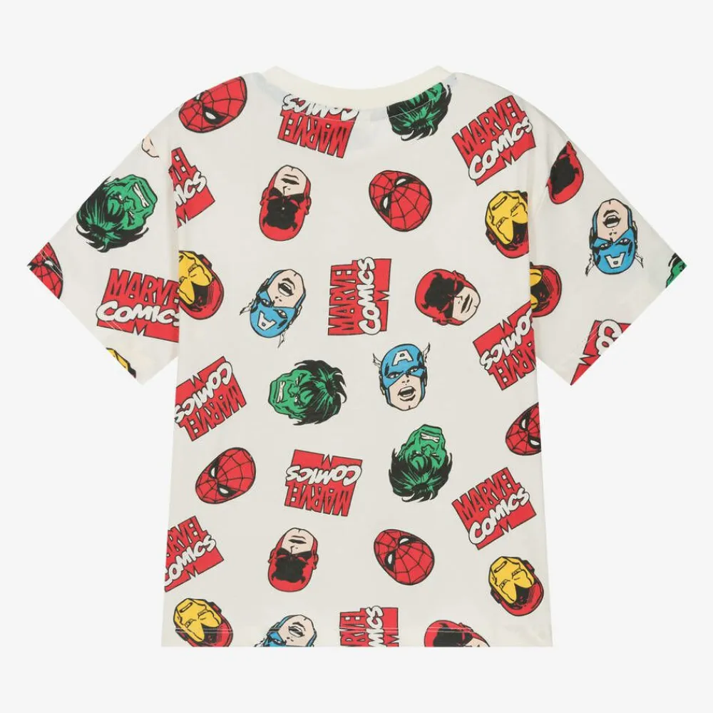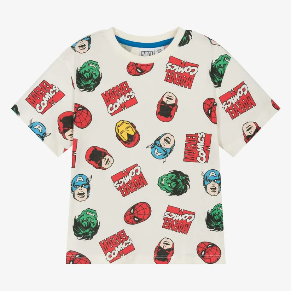 Ivory T-shirt for boys by iDO Baby, made in soft cotton jersey. This short-sleeved top is patterned with colourful graphics and well-known superheroes from Marvel comics. It has a gently ribbed crew neck for casual dressing.