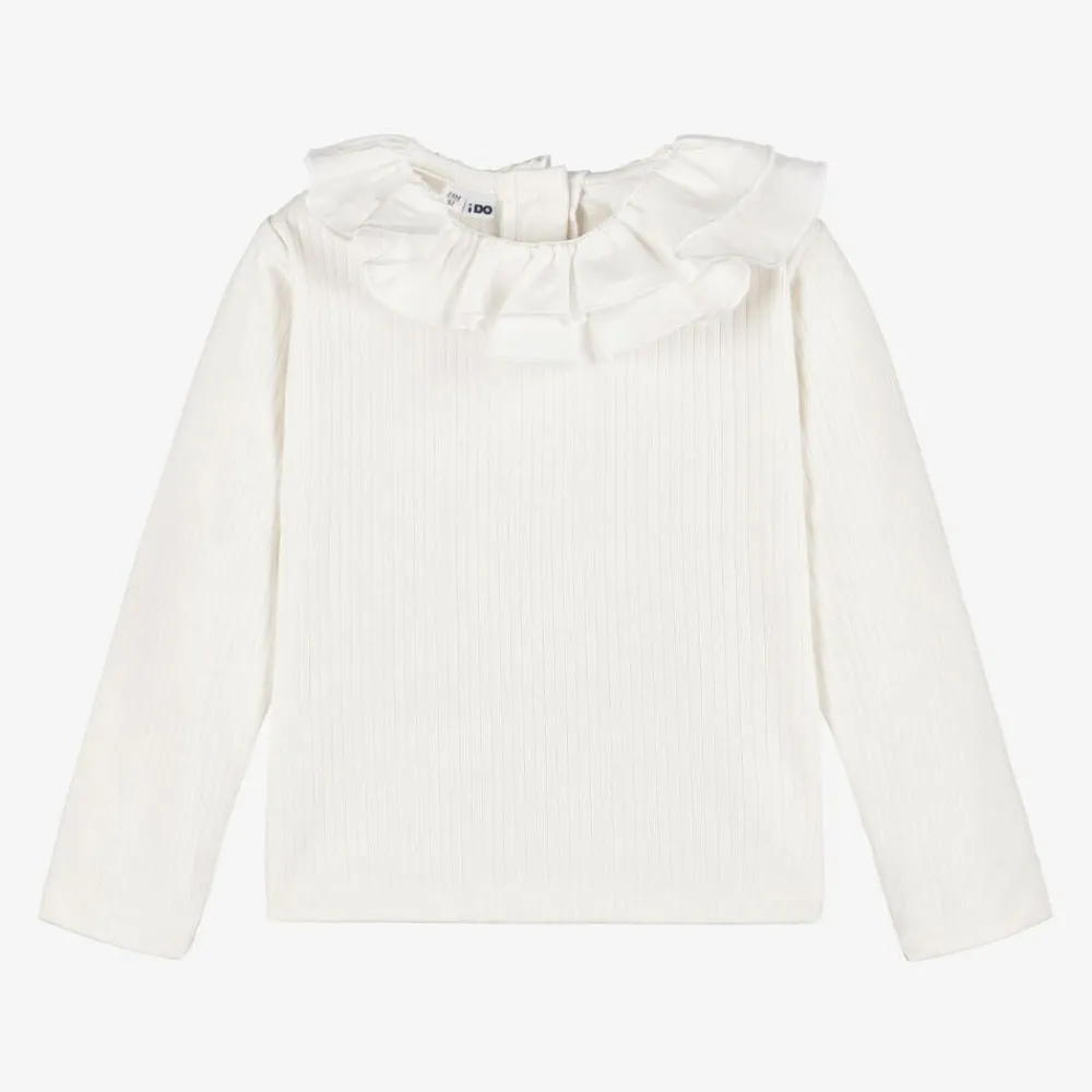 A delightful ivory long-sleeved top for girls by iDO Baby, made from soft ribbed cotton jersey. Fastening neatly with buttons on the back, it has a smooth woven frilled asymmetrical collar for a fun and romantic finish.