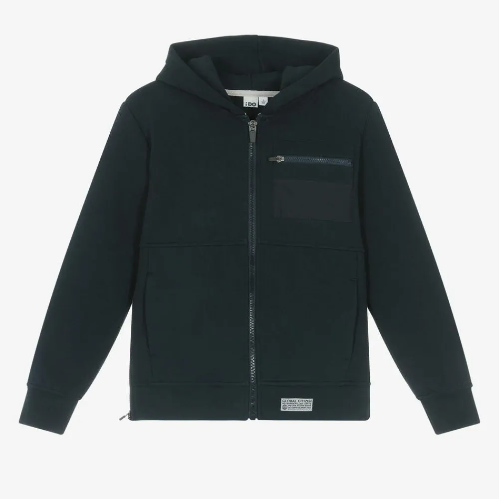 Casual and stylish for older boys, this navy blue hooded zip-up top is from Italian brand, iDO Junior. It is made in luxurious cotton-blend interlock jersey for a soft, mid-weight feel. There is a secure zip-fastening patch pocket on the chest and useful concealed seam pockets below. Ribbed trims complete the casual look, with a 'global citizen' print on the front, and a side seam zip fastening for ventilation and freedom of movement.