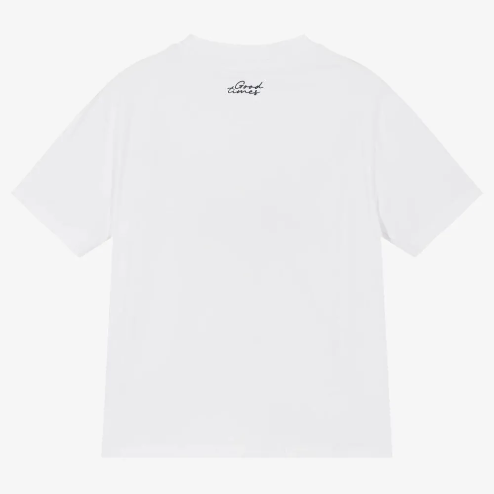 Casual white T-shirt for older boys by iDO Junior, made in soft cotton jersey. It has a 'simply cool' slogan printed across the chest and 'good times' printed on the back of the neck for a cool, graphic look.