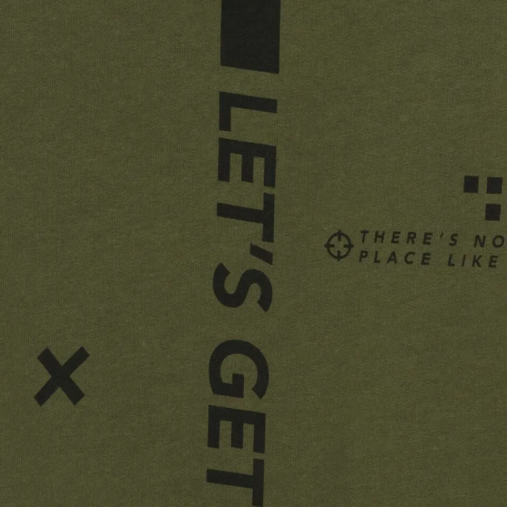 A khaki green tracksuit for older boys by iDO Junior, made from soft mid-weight cotton jersey with a cosy fleecy interior. Great for an adventurous look, the long-sleeved hoodie is printed with neon yellow slogans on the front and a black 'let's get lost' catchphrase design on the back. Complete with a pouch pocket on the front, it has contrasting black detailing for a cool look. The coordinating joggers have slanted pockets, a patch pocket on one leg, and an elasticated drawstring waist for a comfortable fit.