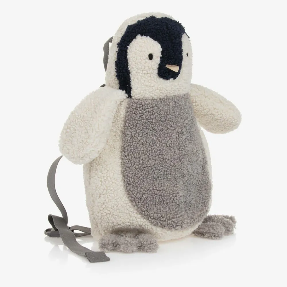 An adorable ivory and grey teddy fleece backpack for boys and girls by luxury brand Il Gufo, in the shape of a penguin. He has a lightly padded head with navy blue detailing and a cute appliqué beak and eyes. Fastening with a zip, the spacious main compartment has a silky lining and is ideal for small essentials. Complete with grey adjustable straps, it has a matching top handle that can be easily hung on a hook.