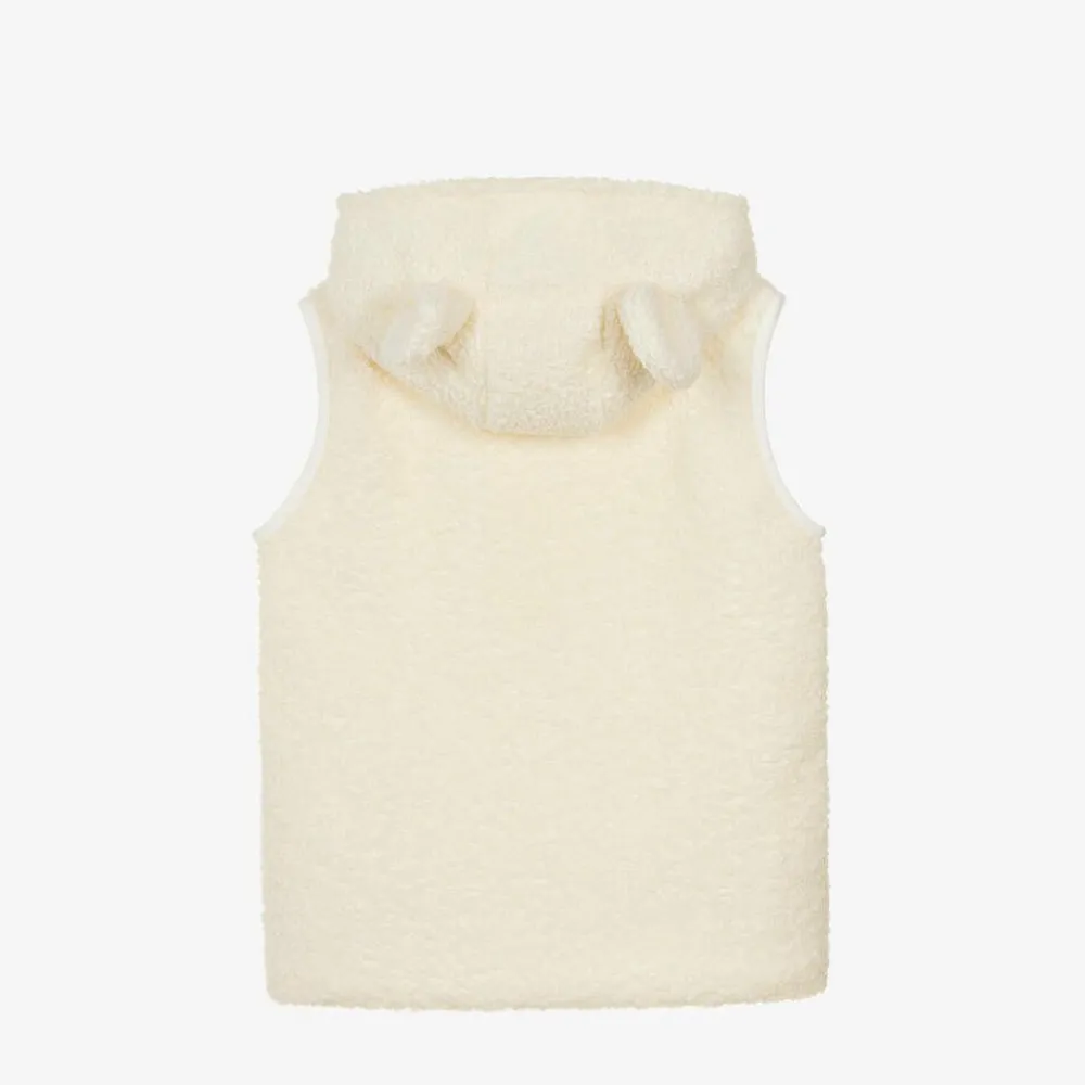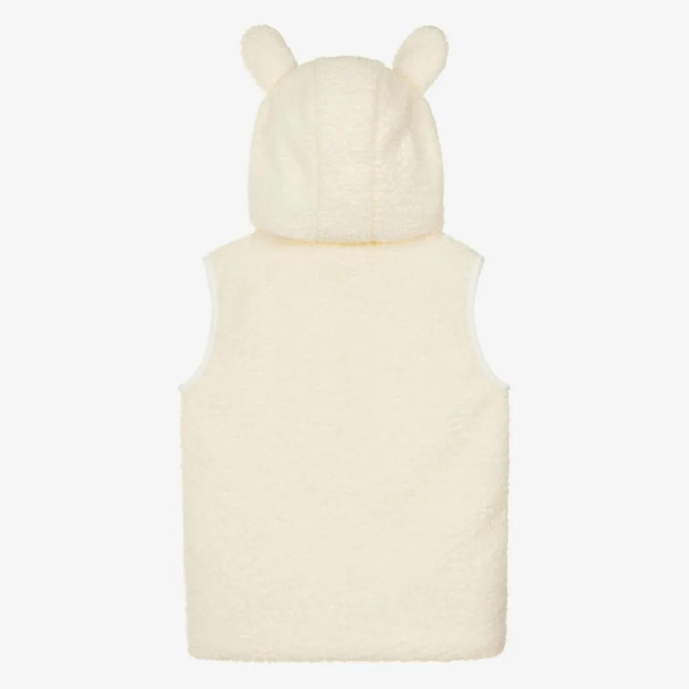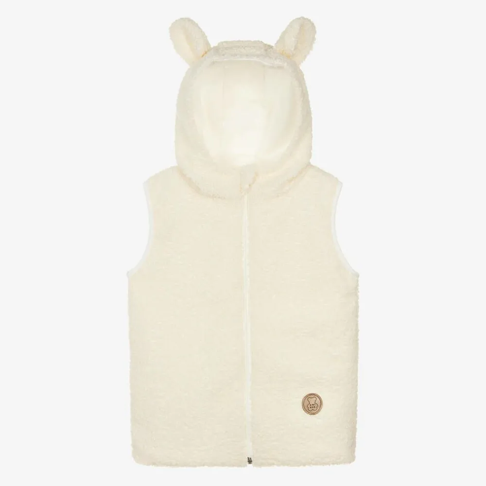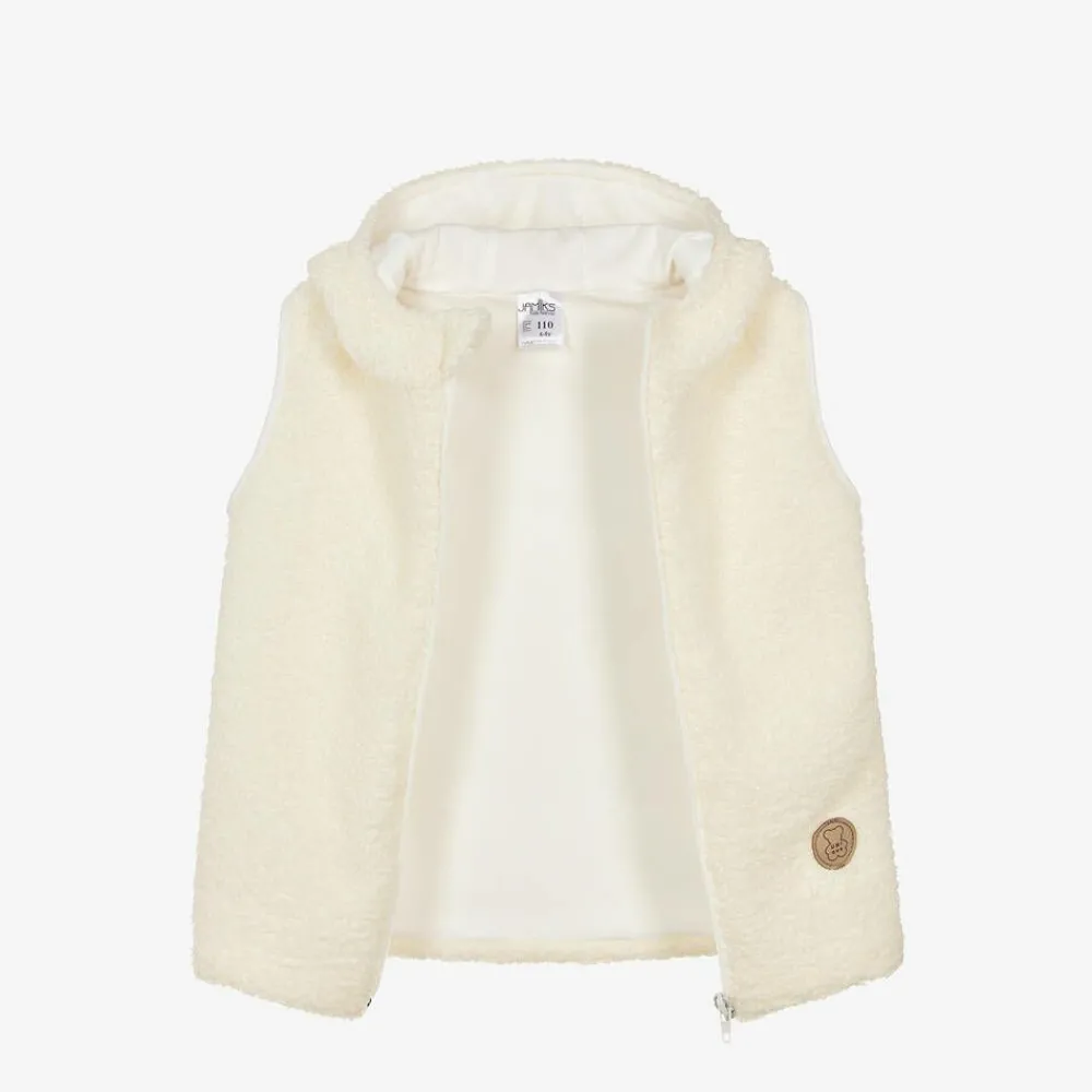 A lovely ivory hooded gilet for little boys and girls by Jamiks, made in textured bouclé fleece. Lined in soft and comfortable cotton jersey, this adorable top has little 3D ears on the hood and a zip fastening with a protective chin guard. For a discreet designer touch, there is a faux leather logo patch on the front.
