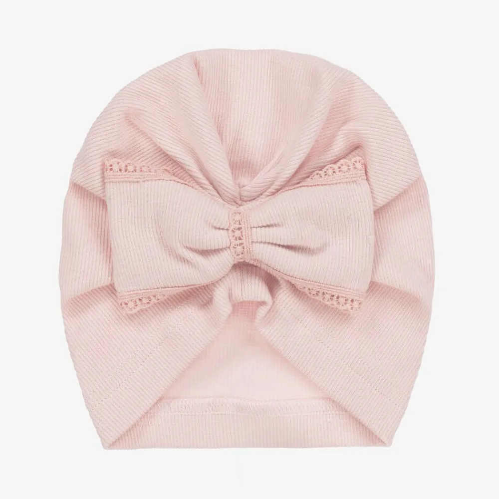 A sweet light pink turban for baby girls by Jamiks, made from soft and stretchy cotton jersey. Designed with style and comfort in mind, this ribbed hat has a decorative bow on the front with pretty crochet lace trims.