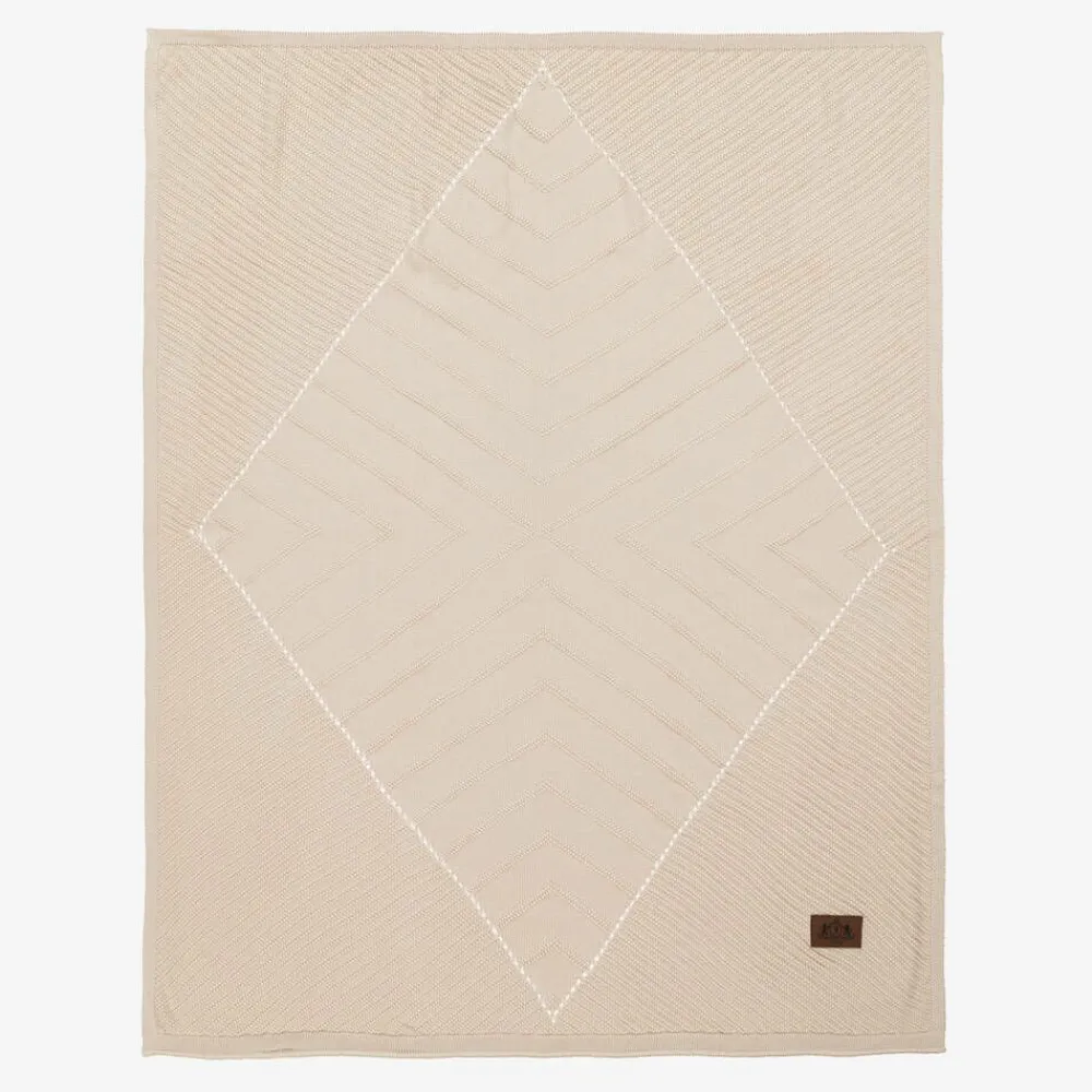 Beige blanket for baby boys and girls by Jamiks, made in super soft viscose. Knitted with a geometric, striped pattern, it is ideal for use in the cot or when out and about in the pram or car seat. It has a brown, eco-leather logo badge sewn on one side.
